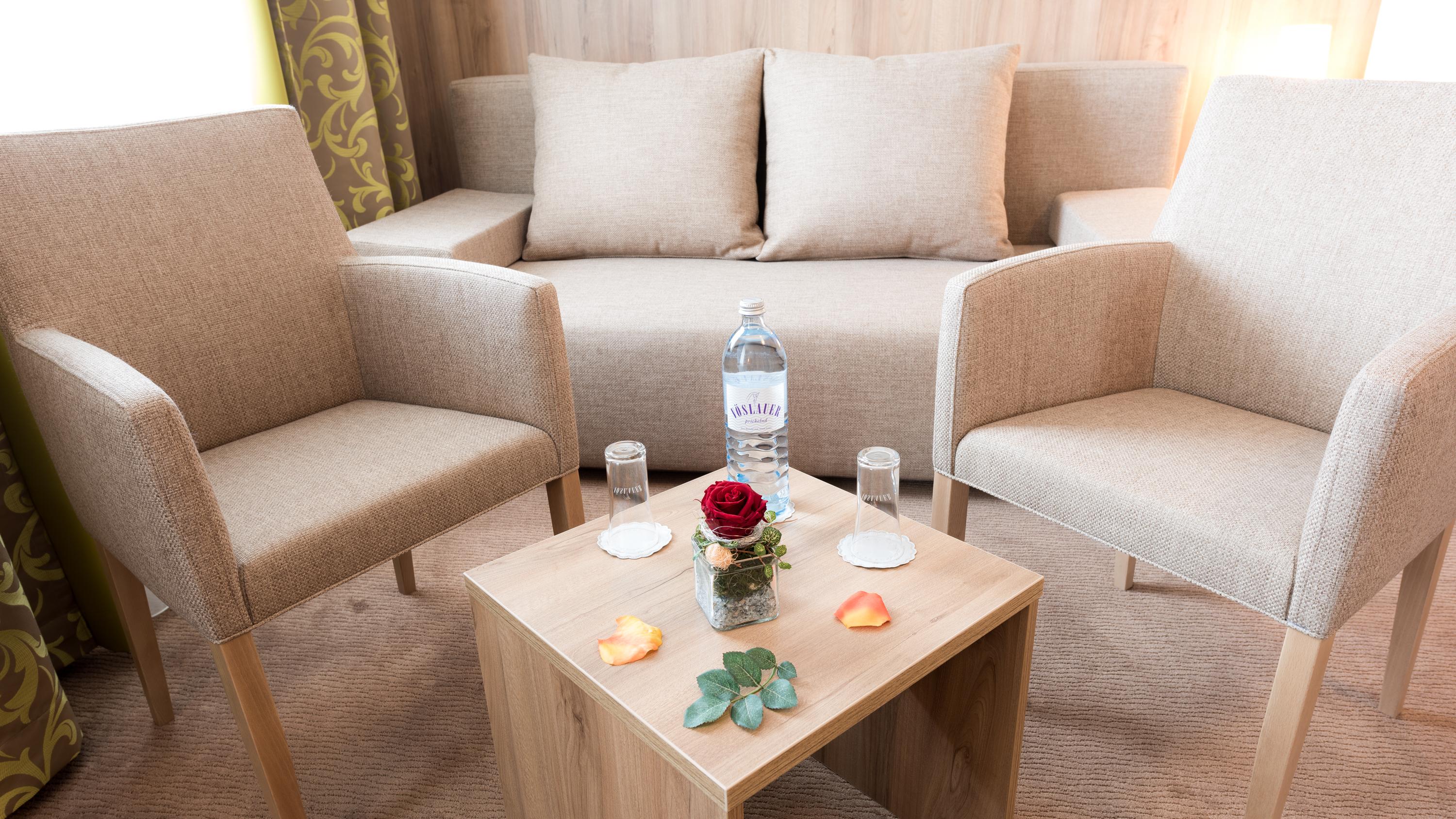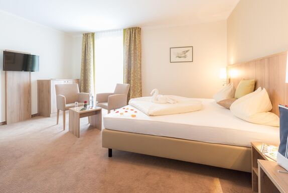 Ca. 45m² + 3m² Balkon, Dusche, separates WC, getrennter Wohnbereich, gemütliche Sitzecke, Sat-TV, W-Lan, Telefon, Safe, Minibar.