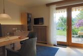 Auf der Terrasse unserer SeeWohnung sitzen Sie mitten im üppig blühenden Garten mit Blick auf den Millstätter See.