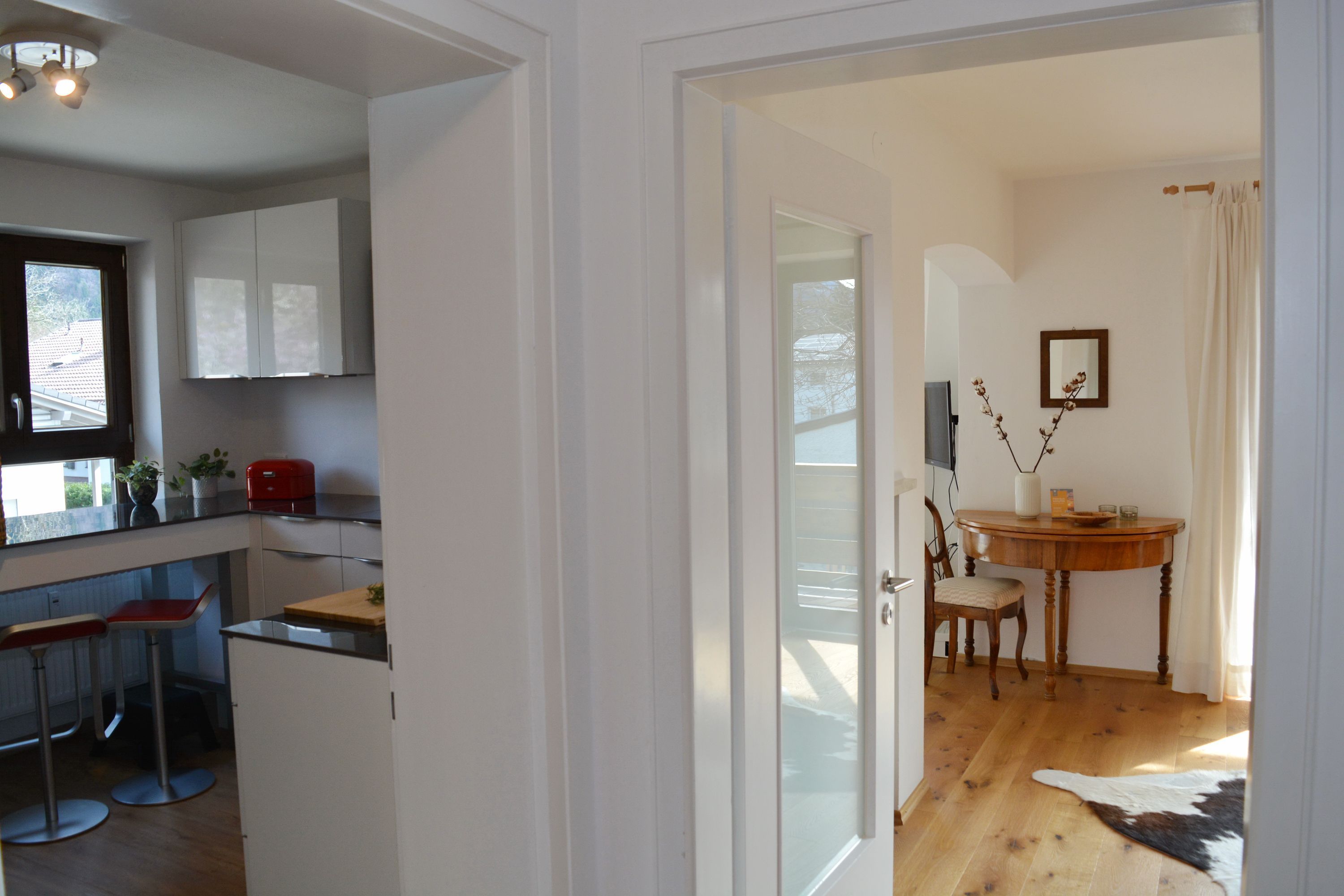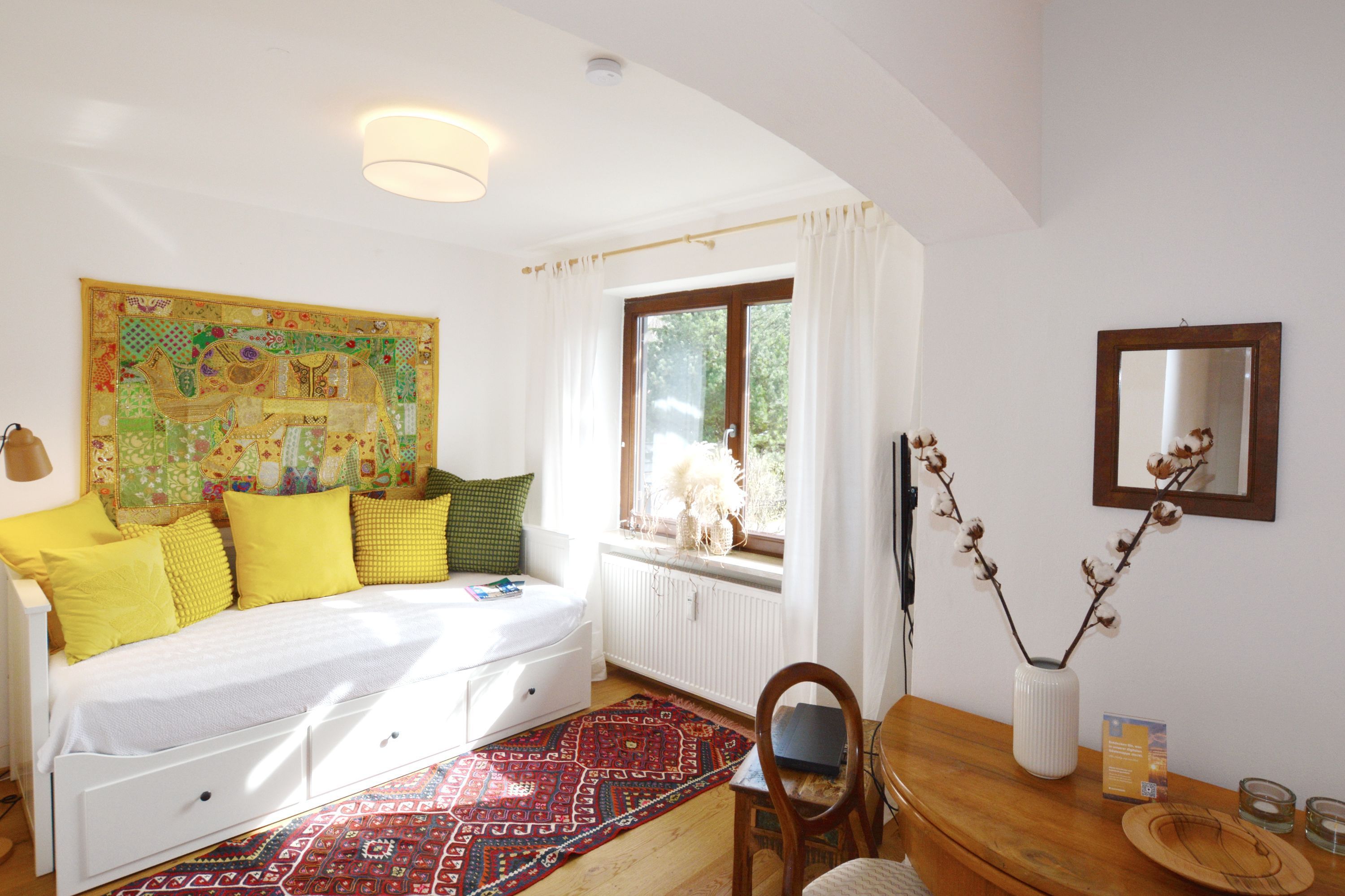 Das Wohlfühlapartment Zillibilly in Aschau im Chiemgau bietet Platz für bis zu 3 Personen und befindet sich in der 1. Etage eines 3-Familienhauses. Es eignet sich besonders für Alleinreisende, Paare oder kleine Familien, die eine entspannte Zeit in der Natur verbringen möchten. Das Domizil vereint Vintage- und moderne Elemente, die durch natürliche Farben, Farbakzenten und Stoffe eine gemütliche Atmosphäre schaffen. Der Wohn- und Essbereich ist der zentrale Raum der Wohnung und lädt nicht nur zum Lesen auf dem Sofa ein. Genießen Sie die Auszeit auch auf dem Südbalkon, welcher über den Wohnbereich betreten werden kann. Jeder Hobbykoch schwingt sicherlich gerne in der topausgestatteten Küche, welche mit großer und hoher Arbeitsfläche, Induktionskochfeld, hohem Backofen uvm ausgestattet ist, seinen Kochlöffel. Im Badezimmer mit einer Walk-In Regendusche können Gäste sich erfrischen, um danach den Abend im Chiemgau ausklingen zu lassen. Nach einem ereignisreichen Tag fällt man dann gerne in das Doppelbett des Schlafzimmers. Ein Einzelbett ist in einer Nische des Wohnbereiches gegeben, welches durch einen Paravant auch optisch von diesem getrennt werden kann.