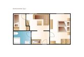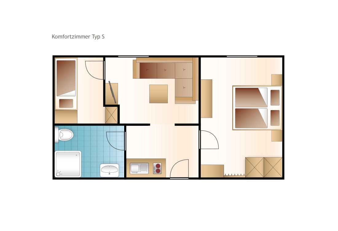 Unser Familienzimmer Saphir mit ca. 35 qm. verfügt über Elternschlafzimmer, Kinderzimmer mit Stockbett, Wohnzimmer, Dusche, Wachbecken, WC und kleiner Kochnische.