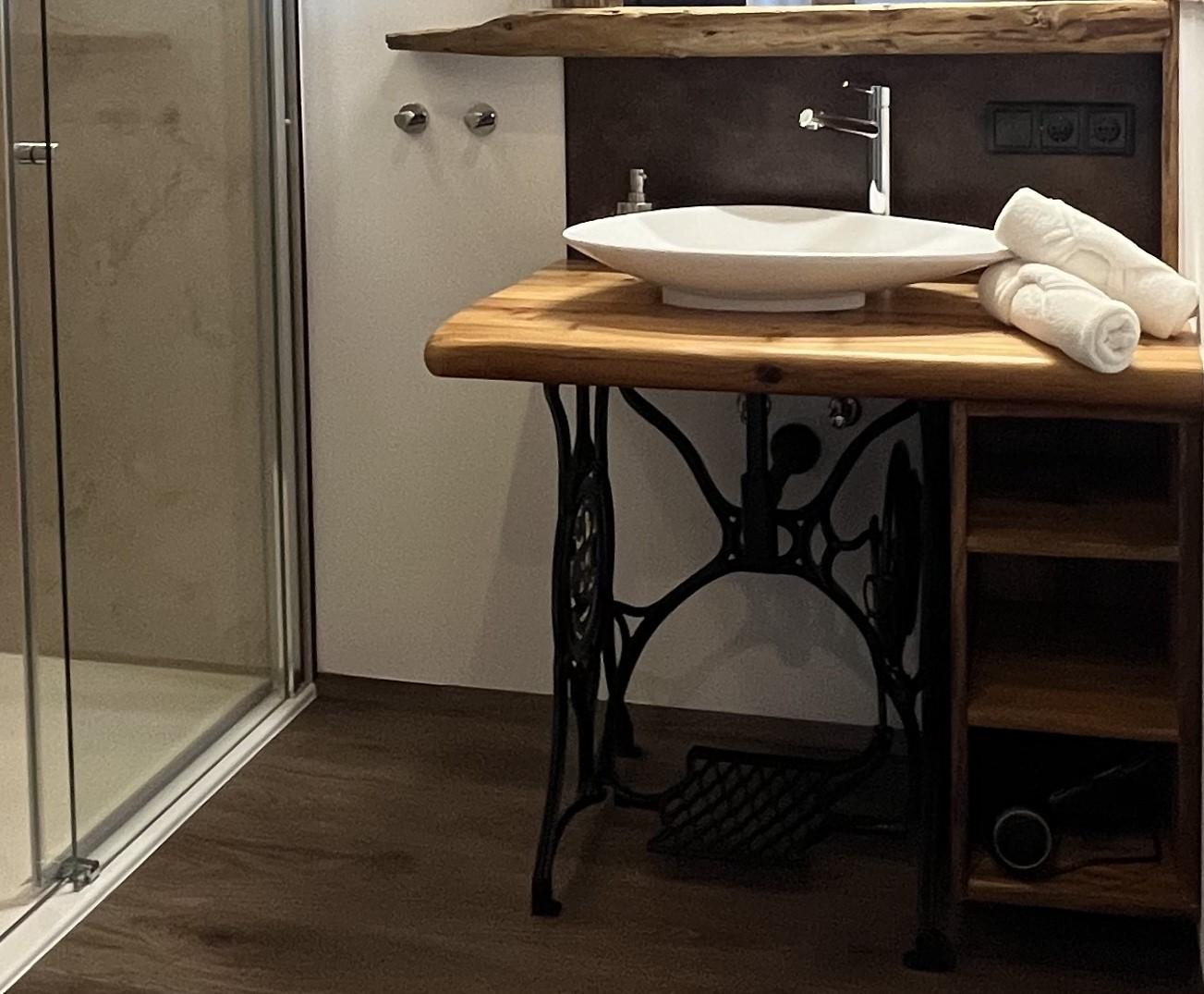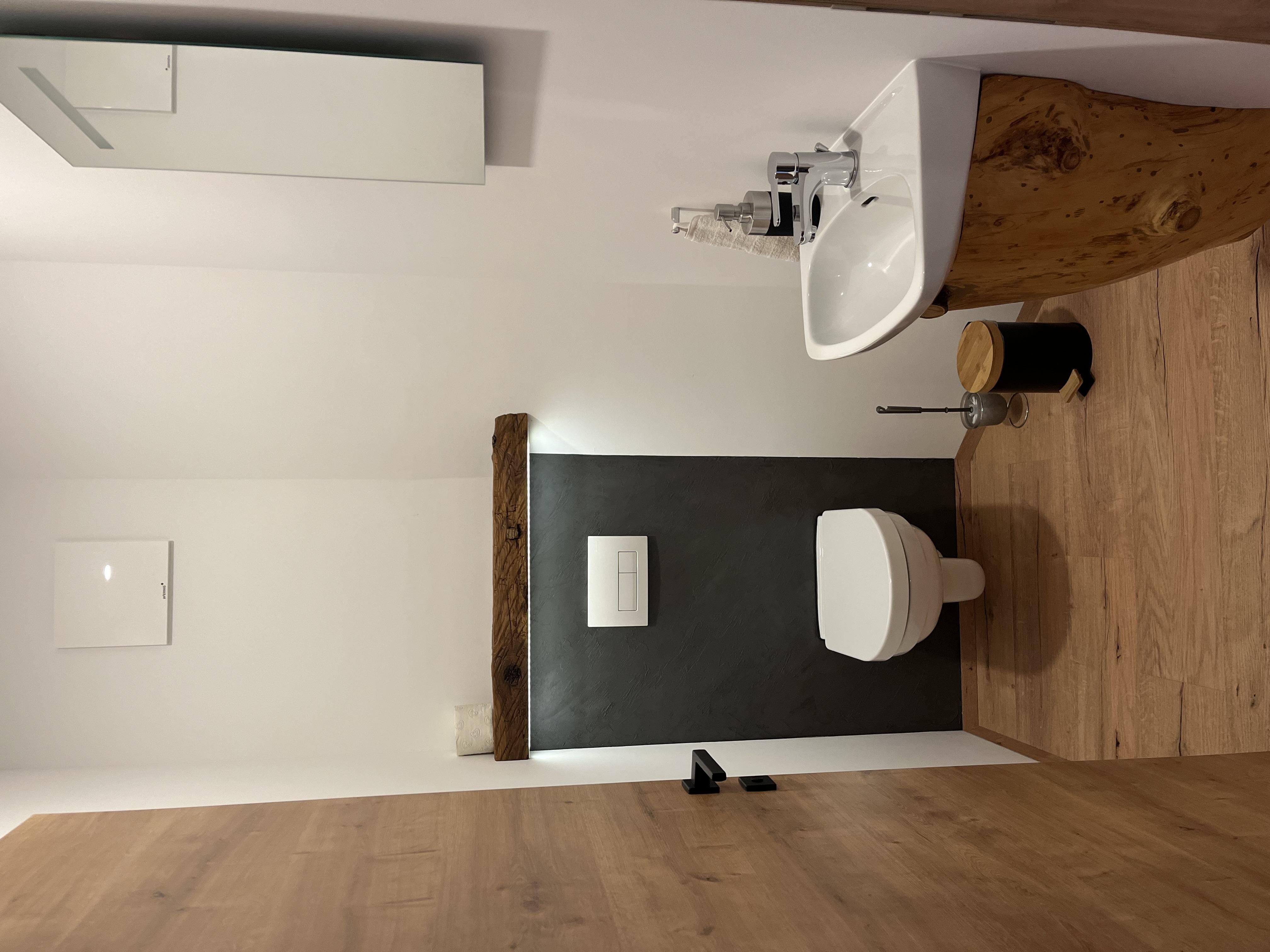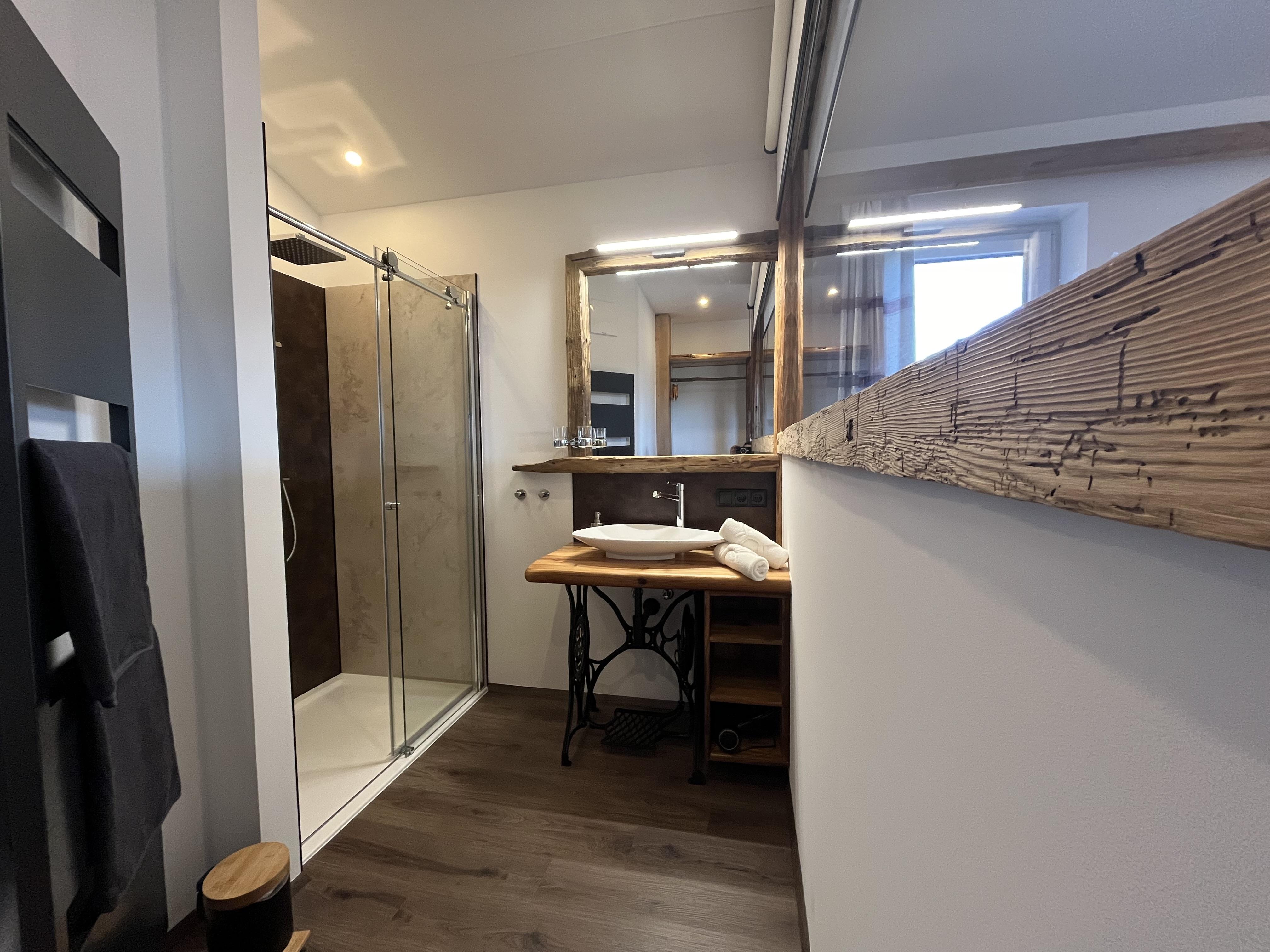 Die Ferienwohnung verfügt über ein eigenes Badezimmer mit Dusche, Handtüchern, Handtuchtrockner und Föhn sowie ein separates WC.