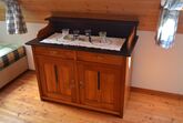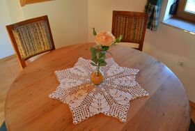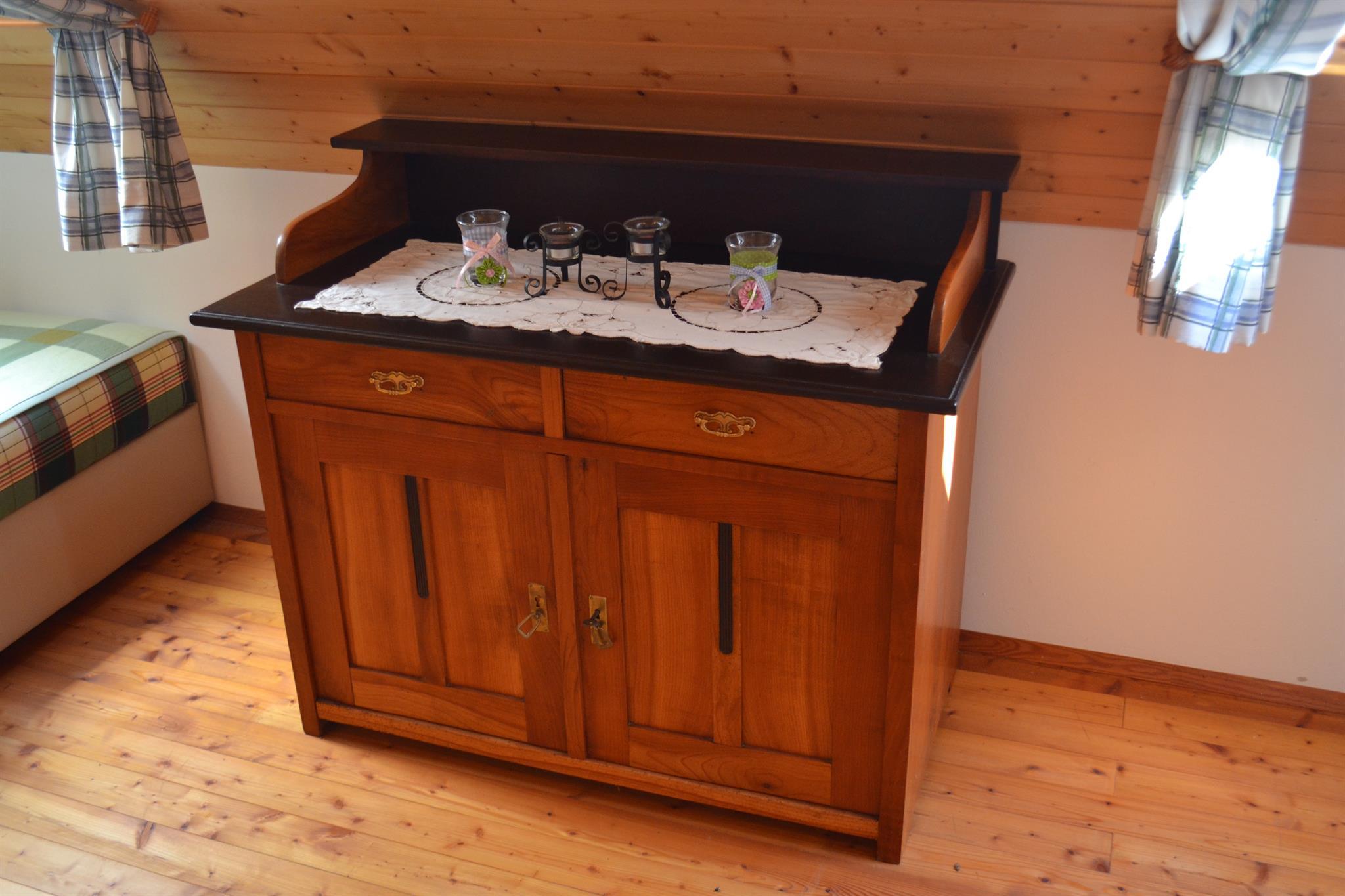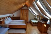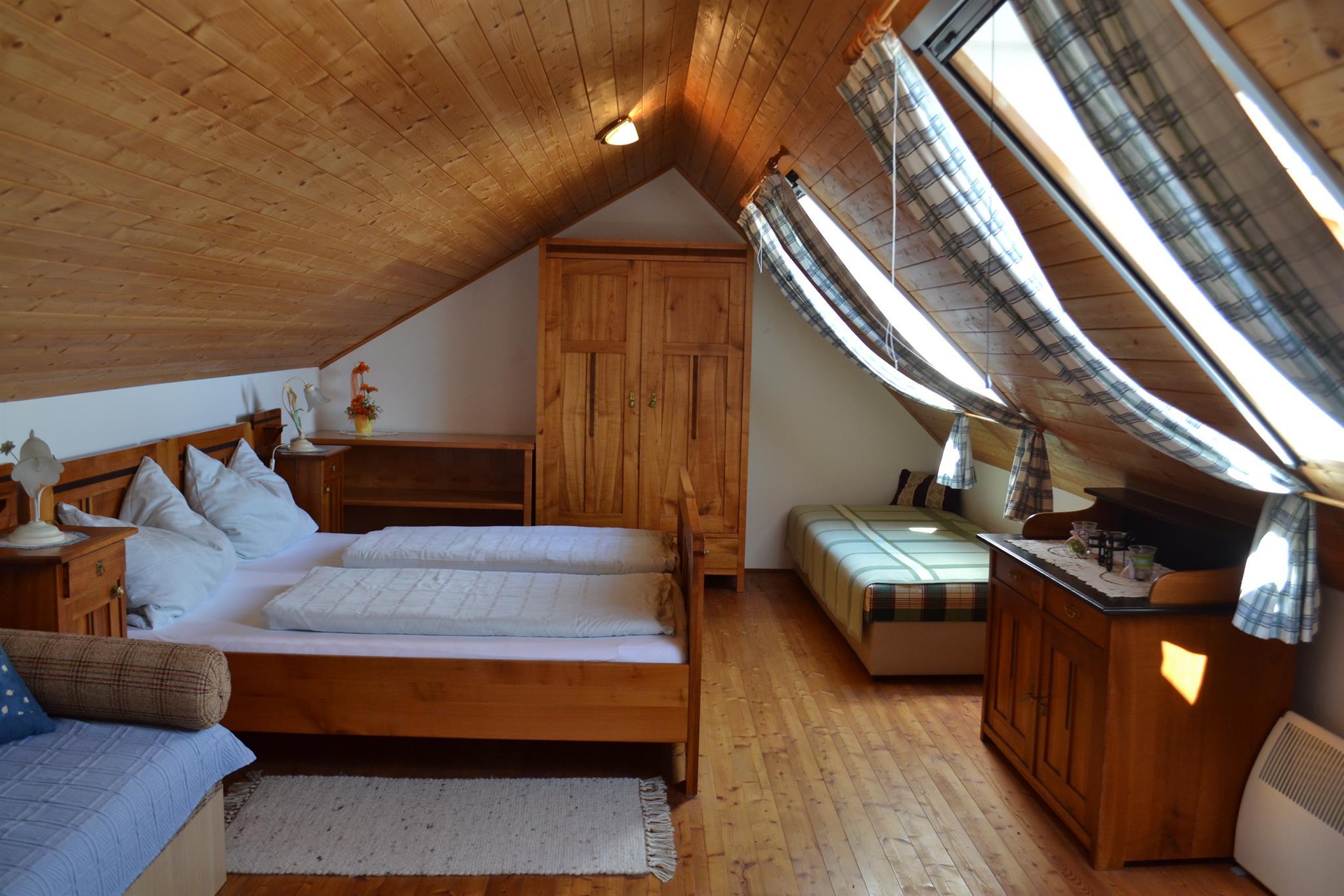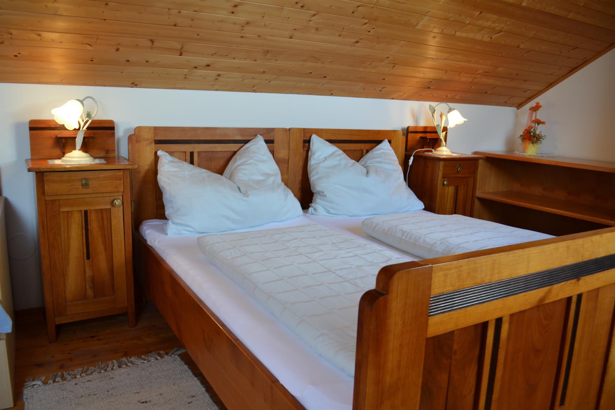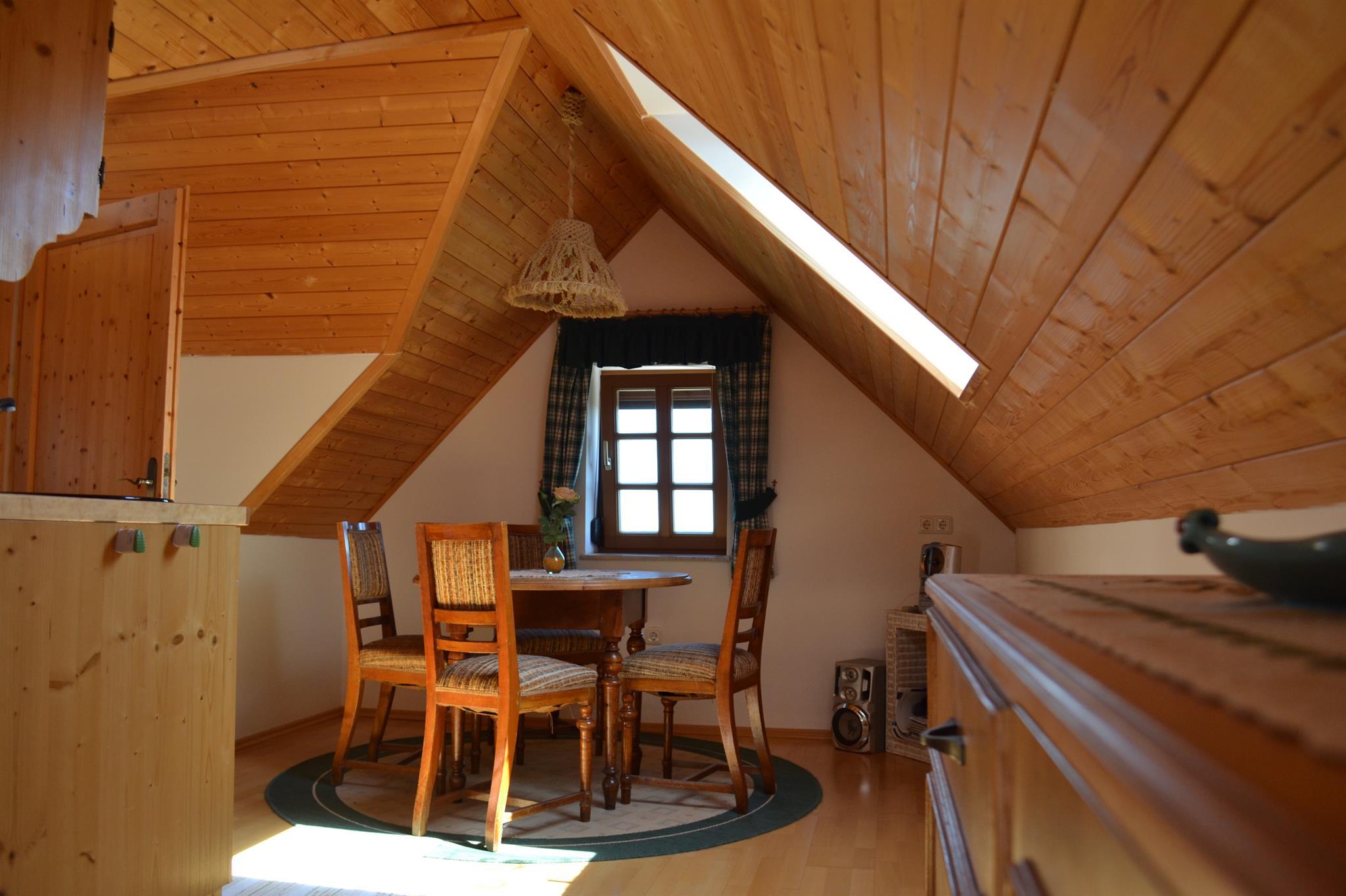 Über einen eigenen Eingang gelangt man ins Dachgeschoss des Kellerstöckls, wo eine behagliche Ferienwohnung mit ca. 40 m² Wohnfläche eingerichtet wurde. Diese verfügt über einen gemütlichen Wohnraum mit einer Kochecke. Ein Schlafzimmer ist mit einem Doppelbett und zwei Zustellbetten für Kinder, sowie mit schönen, antiken Möbeln eingerichtet. Ein Badezimmer mit Dusche und einem separaten WC rundet alles ab. Ein TV-Gerät steht zur Verfügung. Hinter dem Haus lädt eine Gartengarnitur und Liegestühle zum gemütlichen Beisammensein ein. Ein überdachter PKW-Abstellplatz befindet sich direkt neben dem Haus.