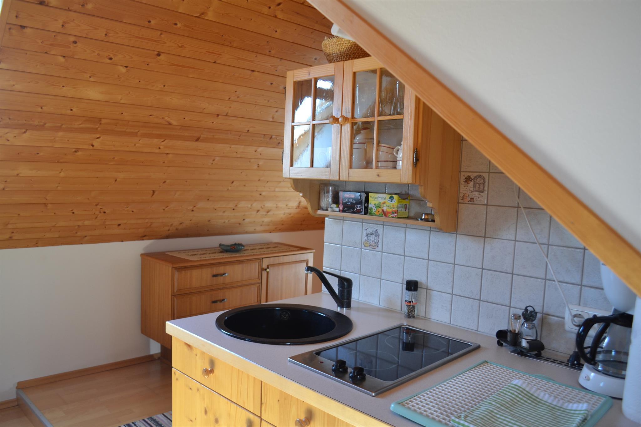 Ferienwohnung mit ca. 40 qm Wohnfläche im Dachgeschoss (Schlafzimmer mit Doppelbett und zwei Zustellbetten), TV, Dusche, WC, Kochecke, überdachter PKW-Abstellplatz, Sitzterrasse.