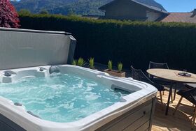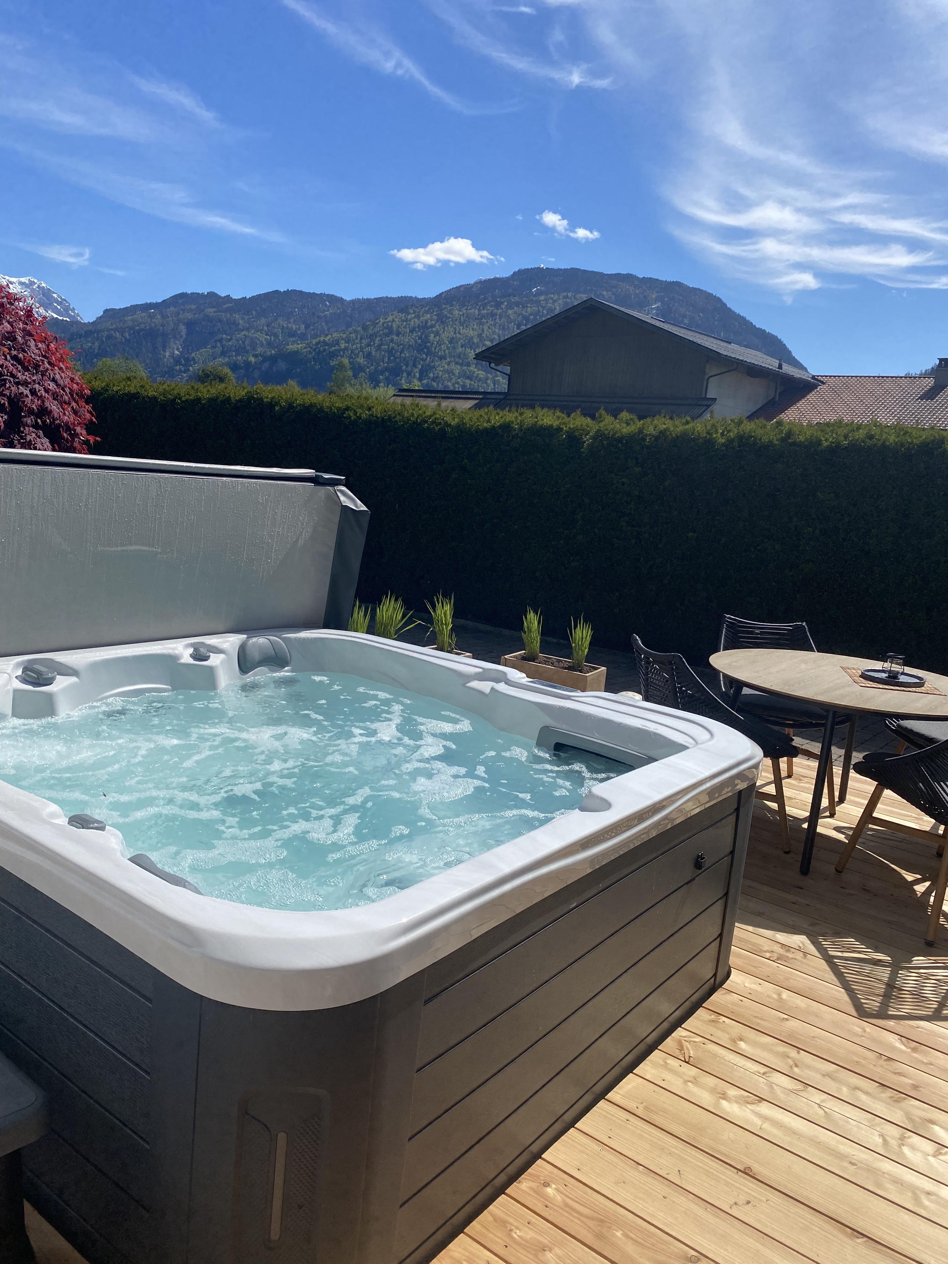 Neu ab Mitte Mai 2024: Zum Relaxen und gemütlichen Beisammensitzen: Holzterrasse für vier Personen und ein Whirlpool