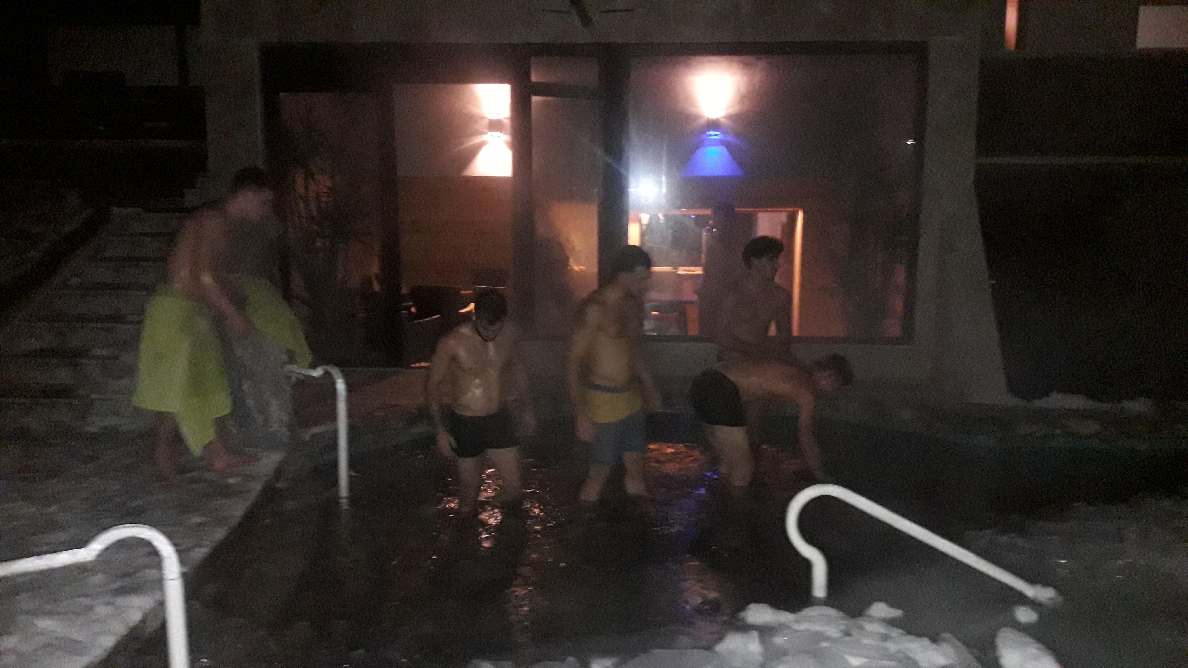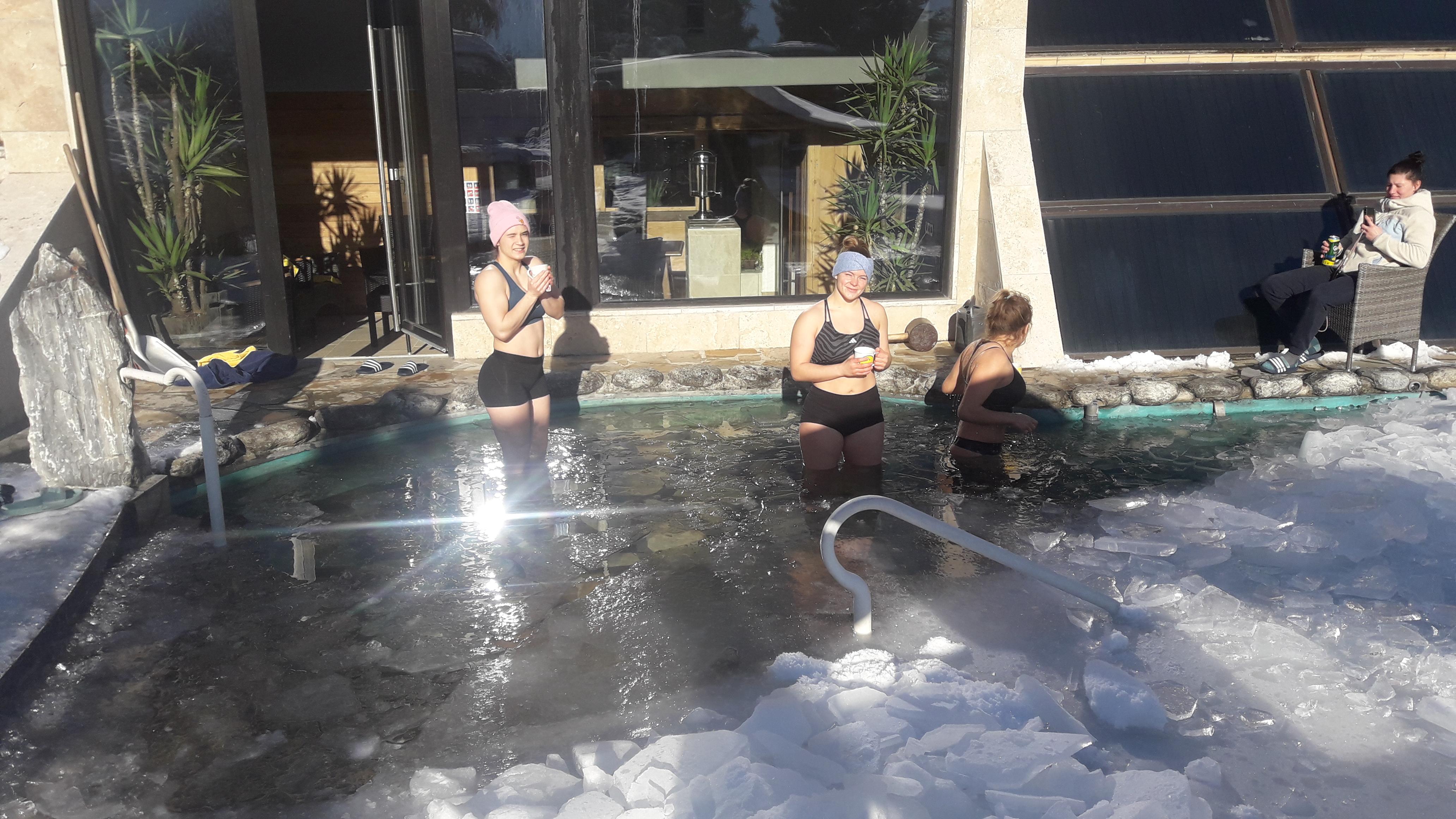 Der Schwimmteich befindet sich direkt vor dem Haus und hat eine Größe von ca. 200 m2. Beim Schwimmteich gibt es über dem Wasserfall eine Sprungmöglichkeit (3 m). Direkt neben dem Schwimmteich befindet sich ein Beachvolleyballplatz. Der Schwimmteich wird im Winter auch zum Eisbaden benutzt.