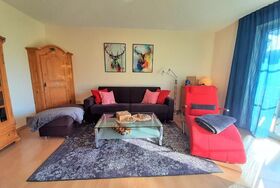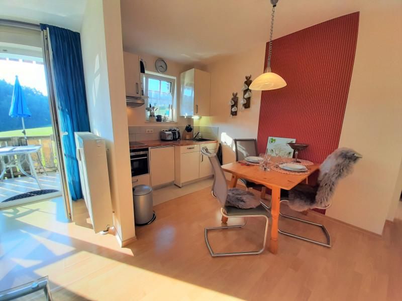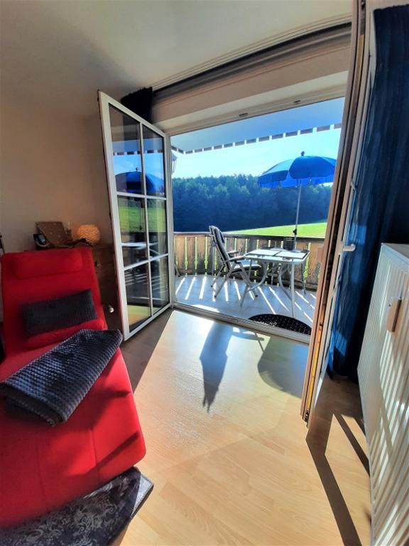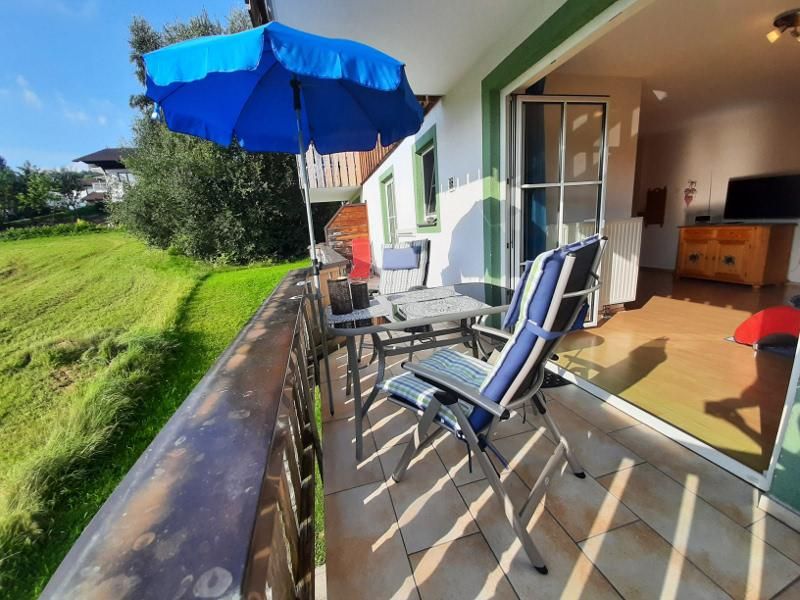Sie hat einen herrlichen großen Balkon, der vom Schlafzimmer und vom Wohnzimmer aus begehbar ist. Sie befindet sich im 1. Stock und bietet einen herrlichen Blick auf Wiesen und Wald. Balkonmöbel für 4 Personen, Wäscheständer sowie Sonnenschirm und eine Sonnenliege sind vorhanden.