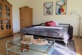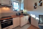 Der Wohn-/Essbereich ist mit einer Küchenzeile mit Kühlschrank und Gefrierfach, Geschirrspülmaschine, Ceran-Kochfeld, Backofen, Mikrowelle, Dunstabzugshaube, Wasserkocher, Toaster, Kapselkaffeemaschine (Nespresso) sowie Filterkaffeemaschine, Stabmixer uvm. ausgestattet. Des Weiteren sind vorhanden: Esstisch für bis zu 4 Personen, hochwertige Couch als Schlafgelegenheit mit Lattenrost für 2 Personen, Relaxliege, Couchtisch, großer TV-Flachbildschirm (mit Schwenkarm), bluetoothfähiges DAB-Radio mit CD, Vitrine (mit einer kleinen Auswahl an Büchern, CDs und Würfelspielen), Stehlampe sowie Verdunklungsrollo.