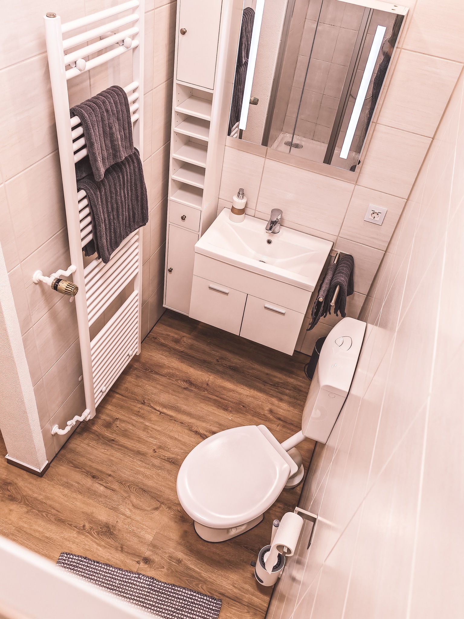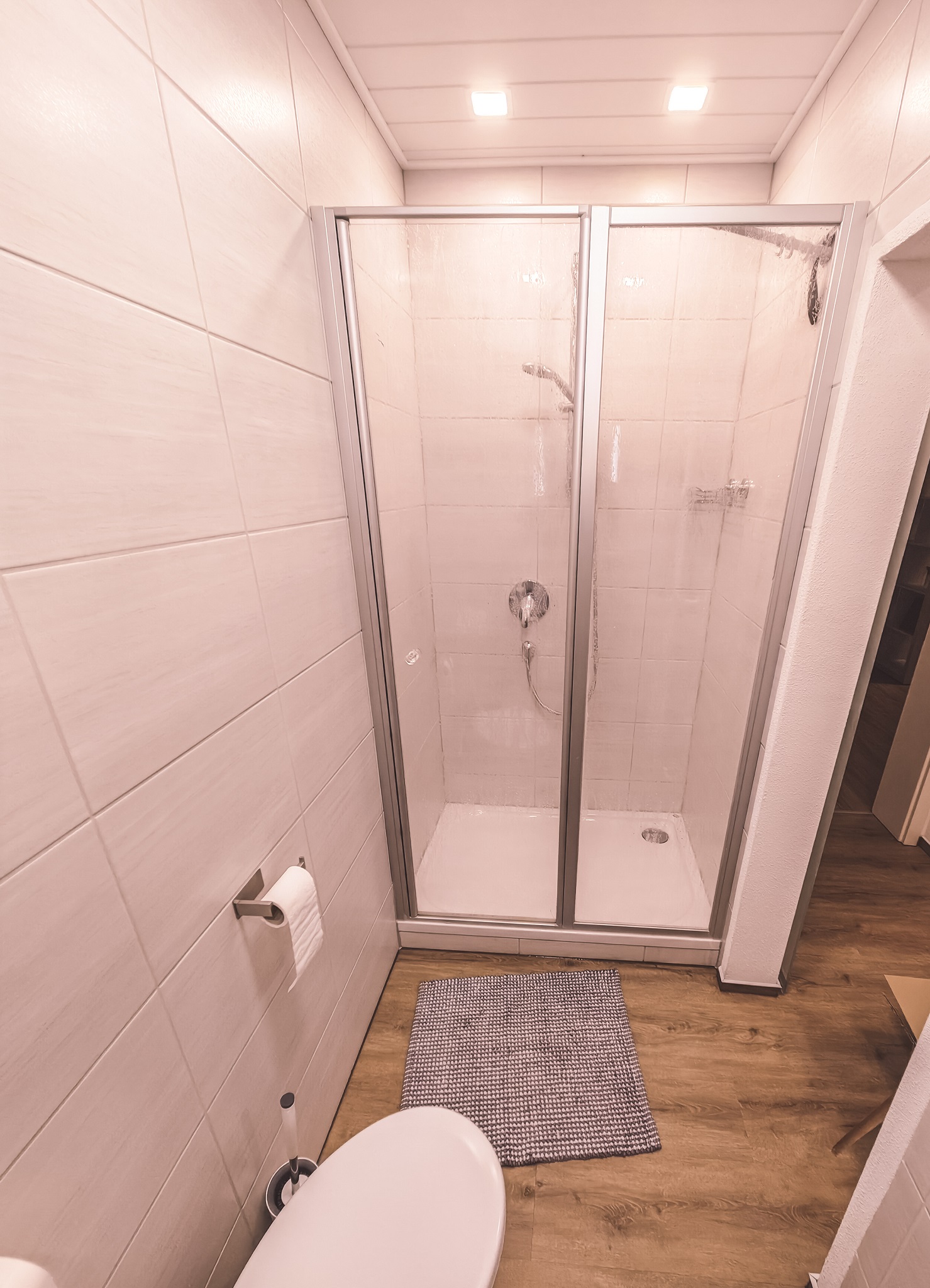 Das Bad verfügt über eine geräumige Dusche, WC, Waschbecken mit Spiegelschrank und Handtuchtrockner.