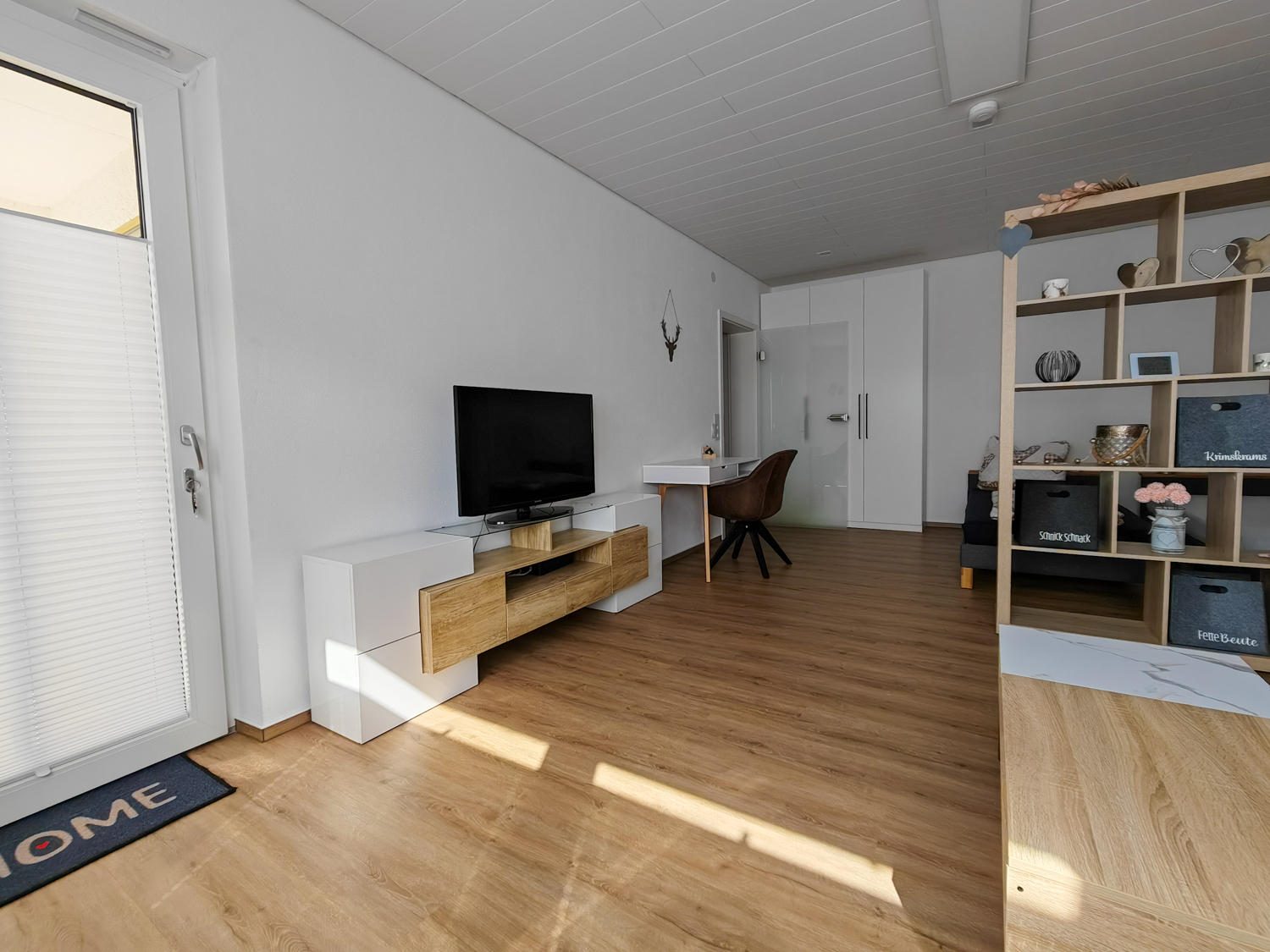 Im gemütlichen Wohnbereich befindet sich ein Sofa sowie ein Flachbildfernseher. Hier hat man den verschließbaren Zugang zur Terrasse.