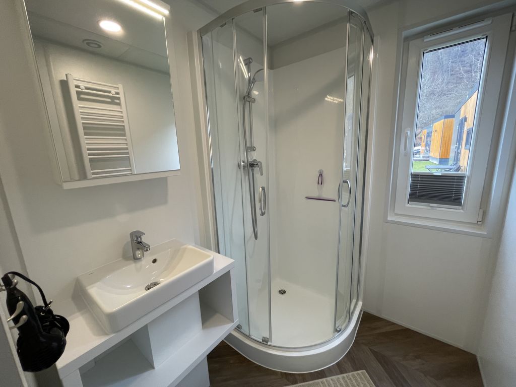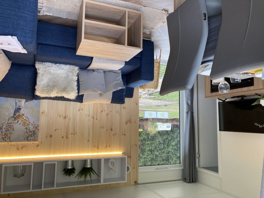 Tiny Haus Altmühlblick, 3-Zimmer-Mobilheim 32 m2, im Erdgeschoss. Modern und gemütlich eingerichtet: Wohn-/Schlafzimmer mit 1 Diwanbett (120 cm, Länge 170 cm), Esstisch und Sat-TV (Flachbildschirm). Ausgang zur Terrasse. 1 Zimmer mit 1 franz. Bett (140 cm, Länge 200 cm). 1 Zimmer mit 2 Betten (80 cm, Länge 200 cm). Offene Küche (4 Glaskeramikplatten, Wasserkocher, elektrische Kaffeemaschine). Dusche/WC. E-Heizung. Kleine Terrasse. Terrassenmöbel. Schöne Sicht auf den Fluss. Parkplatz (1 Auto) in 50 m. Bitte beachten: geeignet für Familien. Nichtraucher-Haus. Rauchmelder, Feuerlöscher. Flexibilität bei der Bettenaufteilung: Es stehen mehr Schlafmöglichkeiten zur Verfügung als die maximal zugelassene Personenzahl, diese darf dennoch nicht überschritten werden.