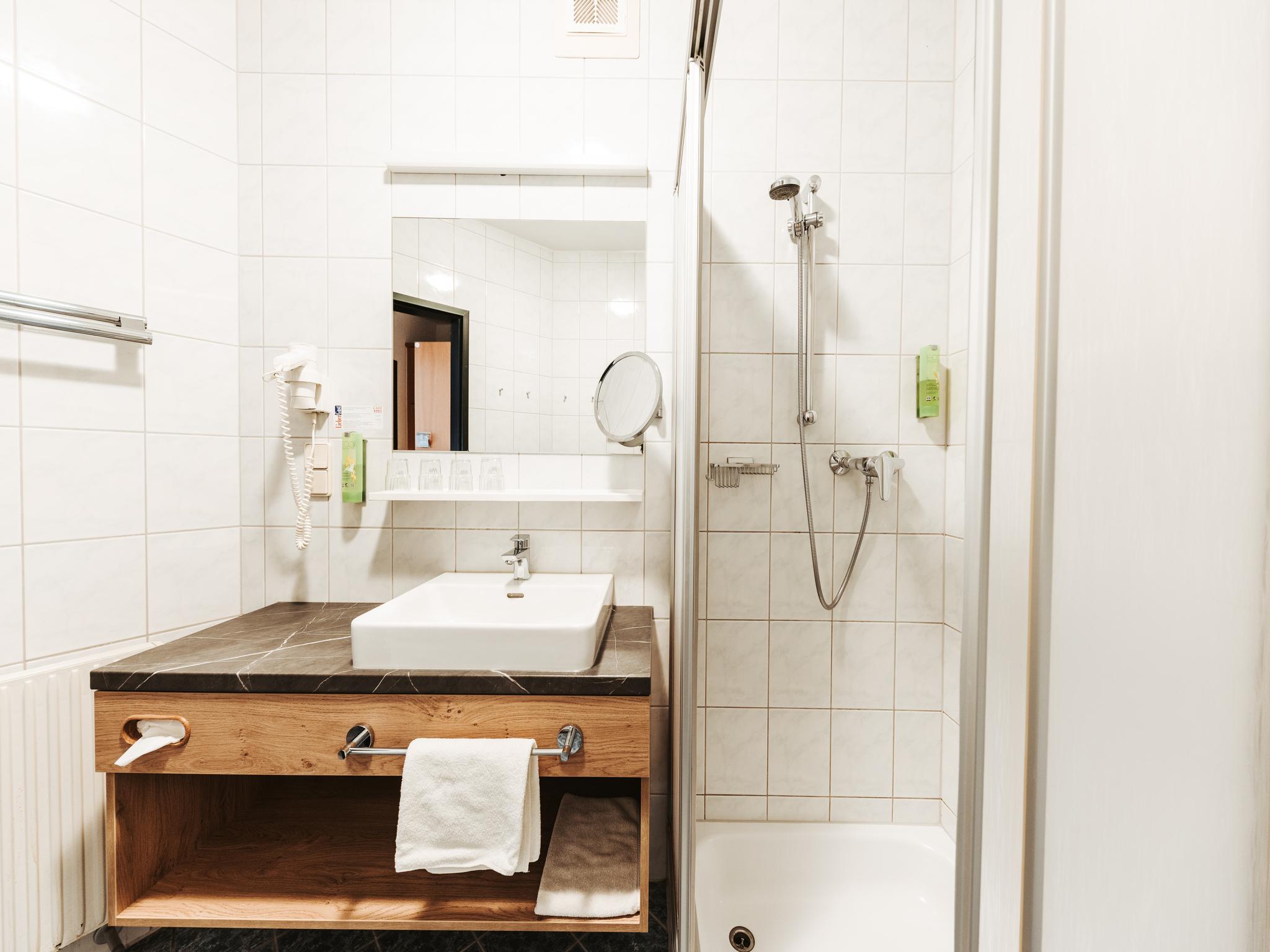 • Badezimmer mit Dusche, separatem WC, Fön