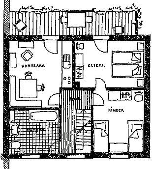 Ferienwohnung I ist 65 qm groß und ist aufgeteilt auf eine Wohnküche, Bad und zwei Schlafzimmer.