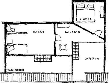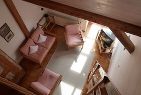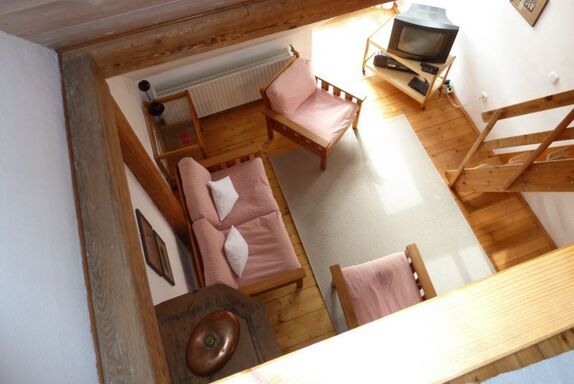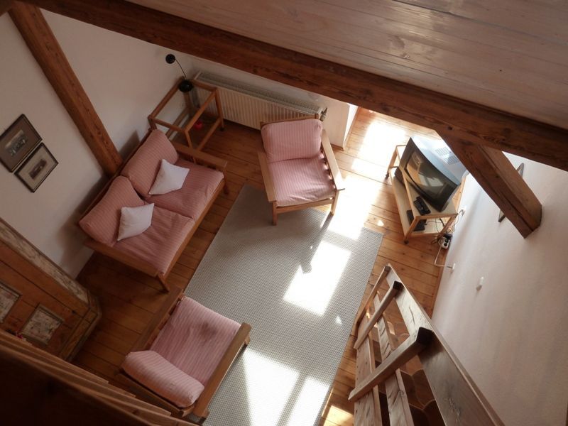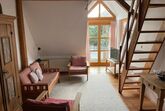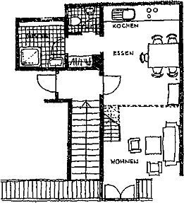 Eine Art Galerie-Wohnung, d. h. zum Schlafen gehts über eine Treppe nach oben. 2 separate Schlafzimmer, großzügiger Wohnraum, Einbau-Küche, Bad/Dusche, separates WC.