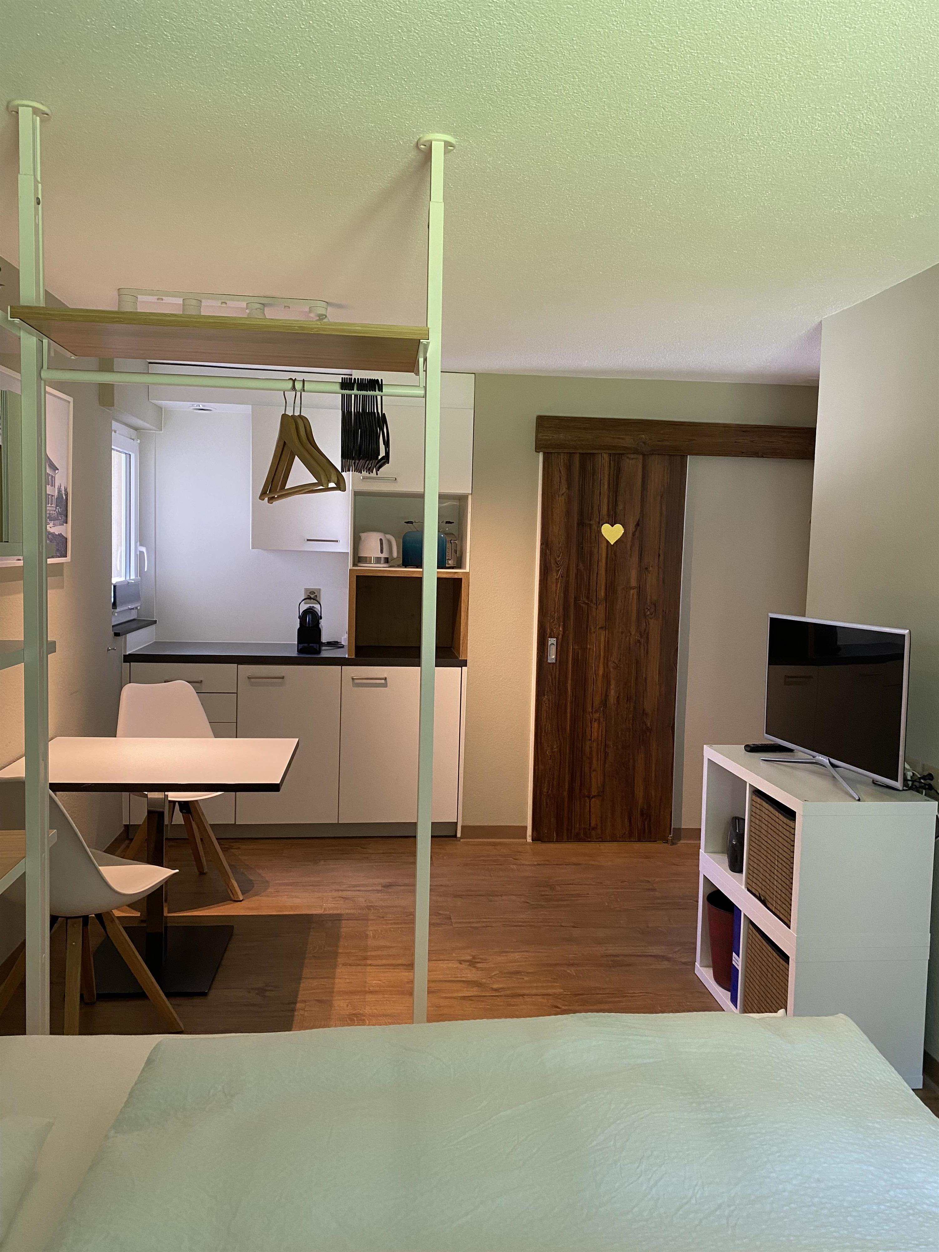 Wohnschlafzimmer modern eingerichtet mit einem Grand-Lit ( 160/200cm) Esstisch mit 2 Stühlen, Radio, TV