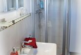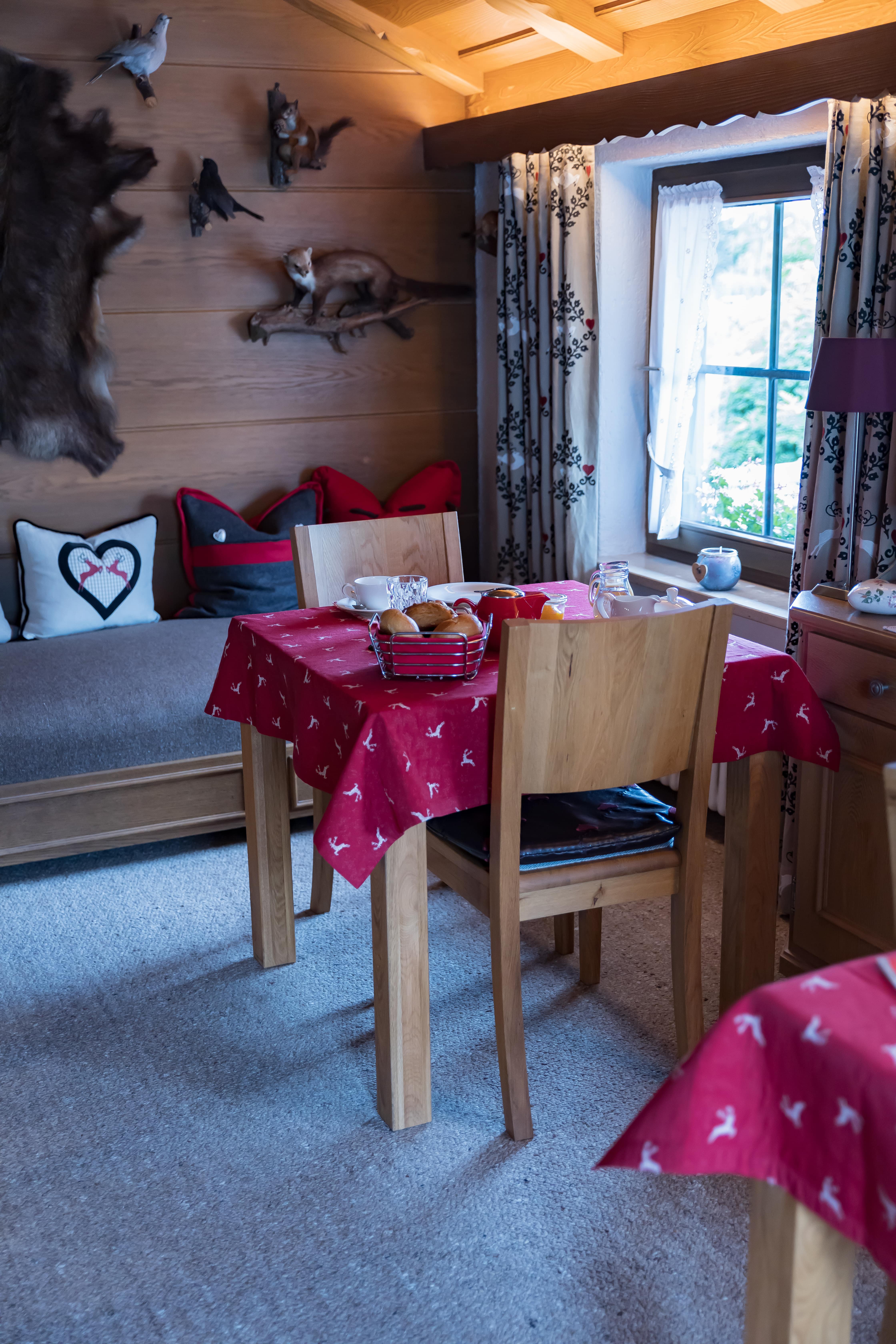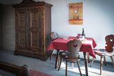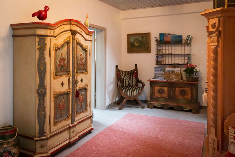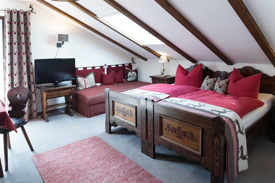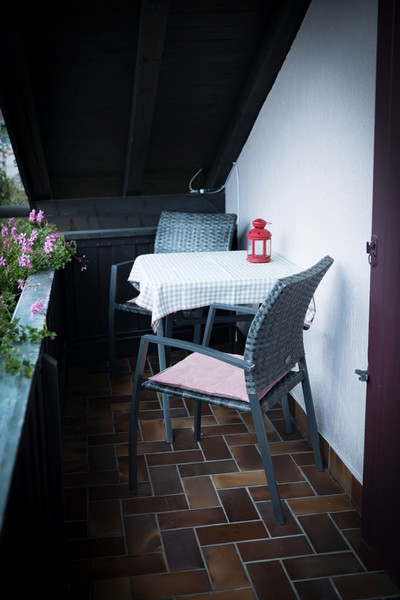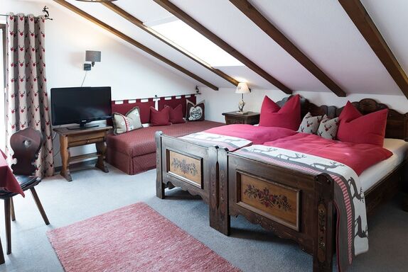 Dreibettzimmer mit Dusche/WC, Balkon mit Bergblick, Doppelbett, Schlafcouch, Kabel/Sat-TV-Anschluss, Fön, Radiowecker, Gästekühlschrank, Frühstücksterrasse, Unterstellmöglichkeit für Fahrräder, Nichtraucherzimmer, kostenfreies WLAN.