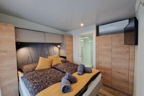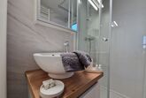 Im Wohnbereich, ebenfalls klimatisiert, erwartet Sie eine gut ausgestattete Küche mit Kühlschrank, E-Herd inklusive Backofen und Geschirrspüler, um Ihren Aufenthalt angenehm zu gestalten. Eine bequeme Couch, ein Smart-TV und eine Essgelegenheit mit Hockern schaffen eine entspannte Atmosphäre. Ein zweites Badezimmer mit WC, Dusche und Waschbecken ist direkt vom Wohnzimmer aus zugänglich.