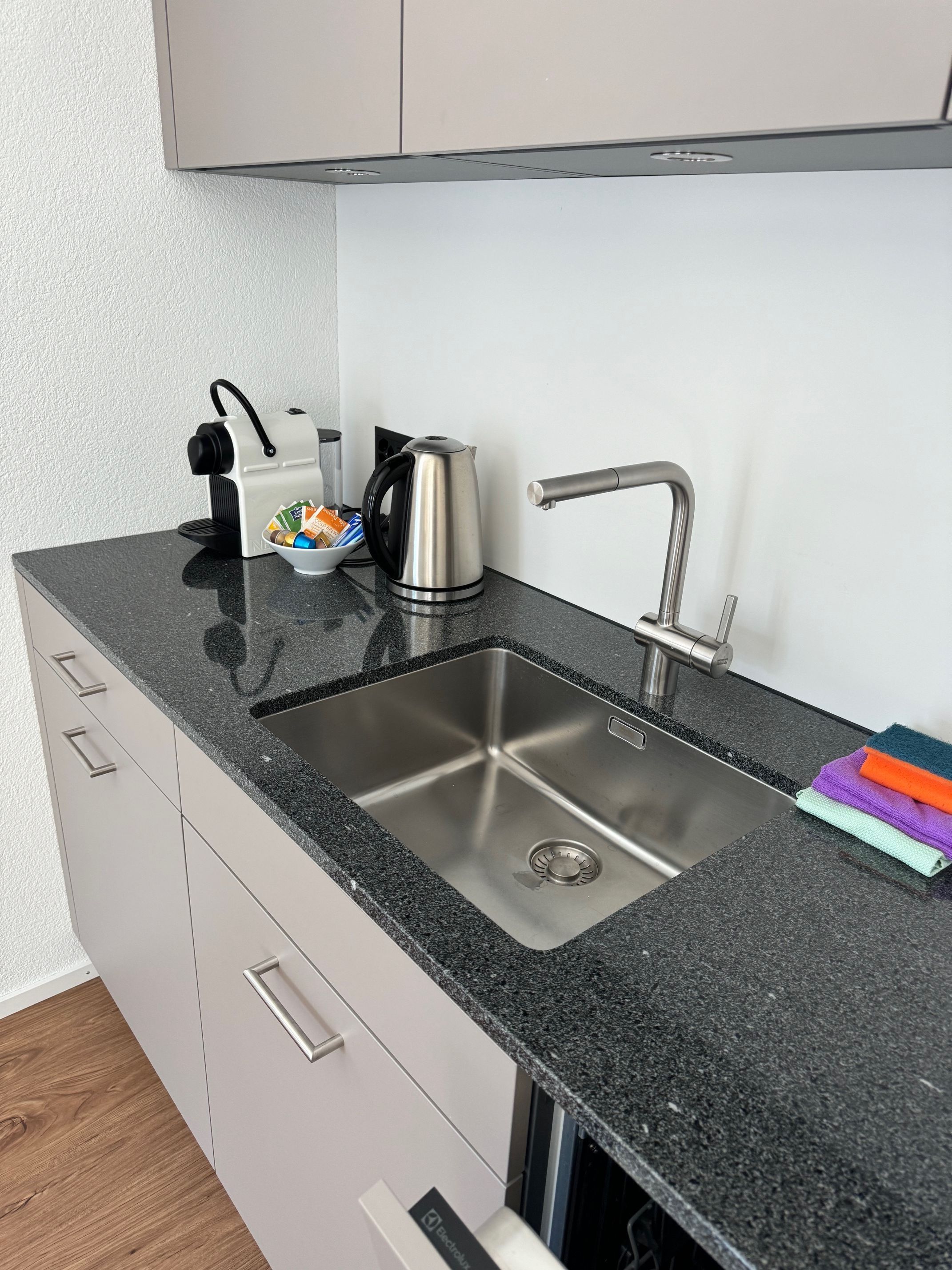 Einer voll ausgestatteten Küche inkl. Backofen, Spülmaschine, Kaffemaschine, Wasserkocher und Raclette-Set