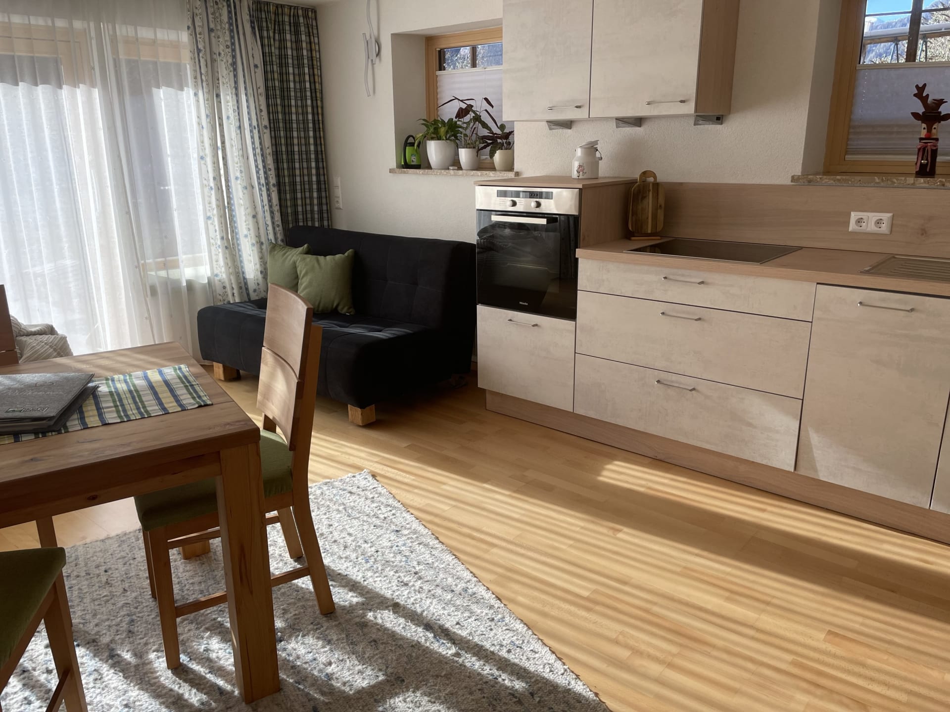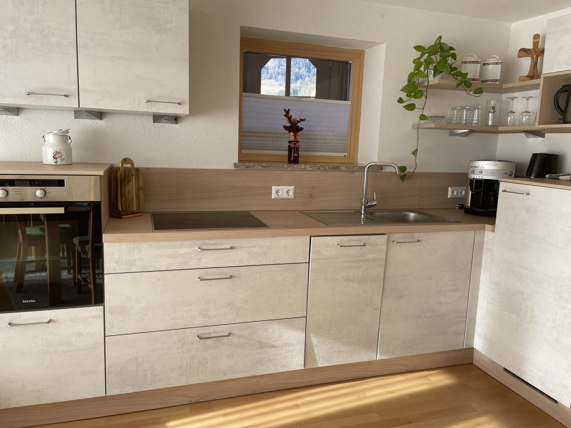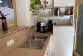 Sie finden Vollholzmöbel, selbst verlegten Holzboden, Geschirrspüler, Waschmaschine, Kaffeevollautomat, Backofen, Kühlschrank mit Gefrierfach.