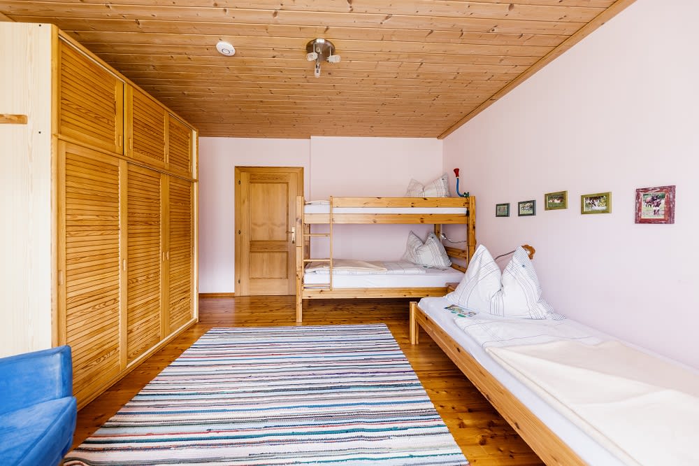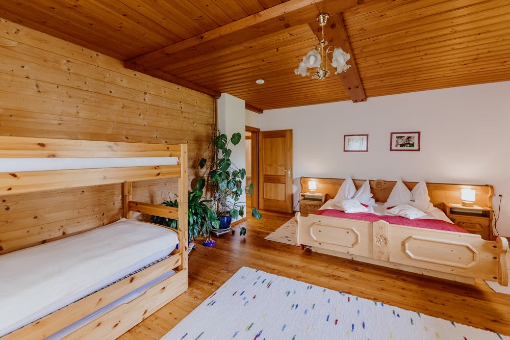* Familienschlafzimmer mit Doppelbett und Stockbett