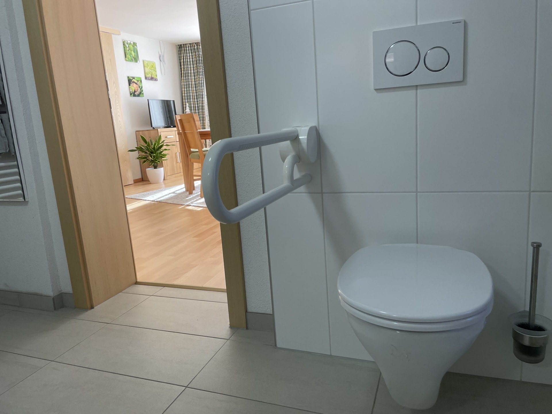 * barrierefreies Badezimmer mit Duschsitz und Haltegriffen, Waschmaschine, Kinderklo