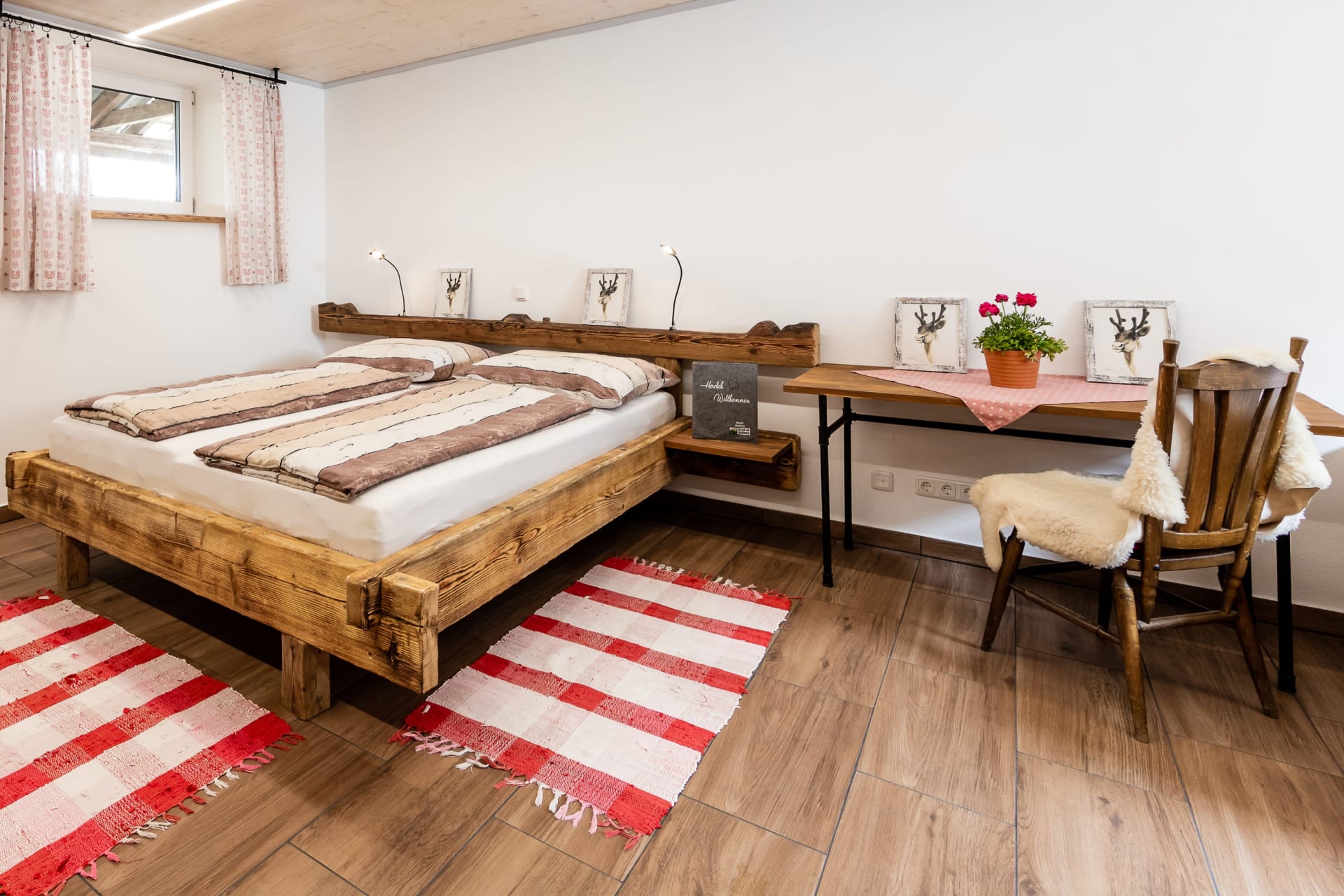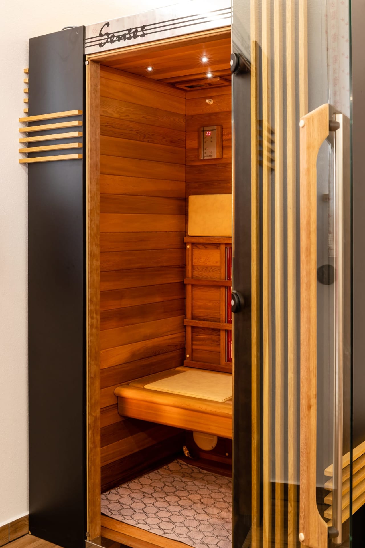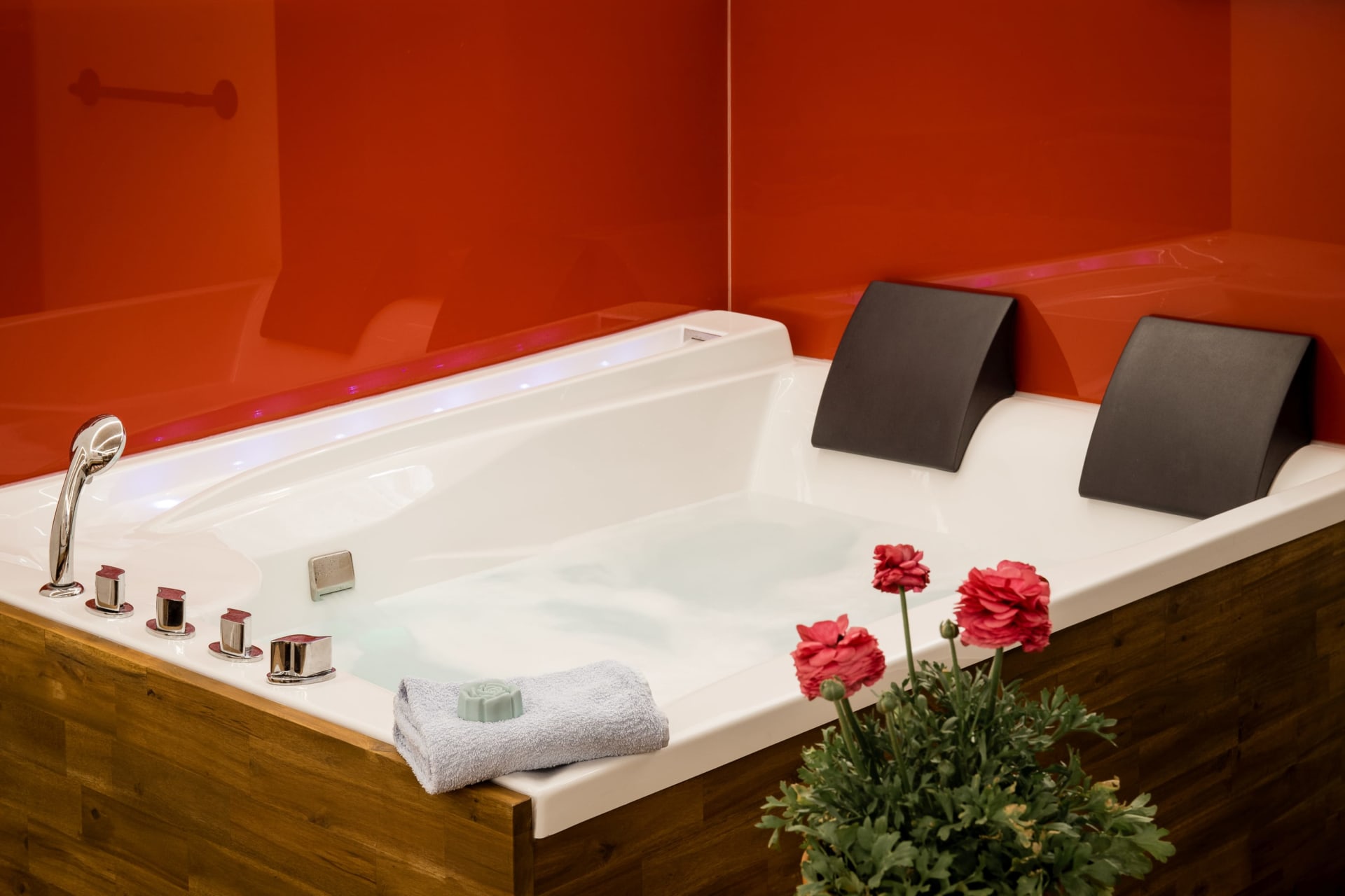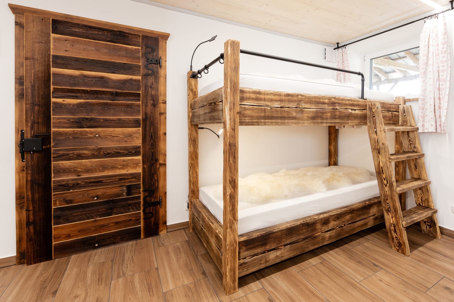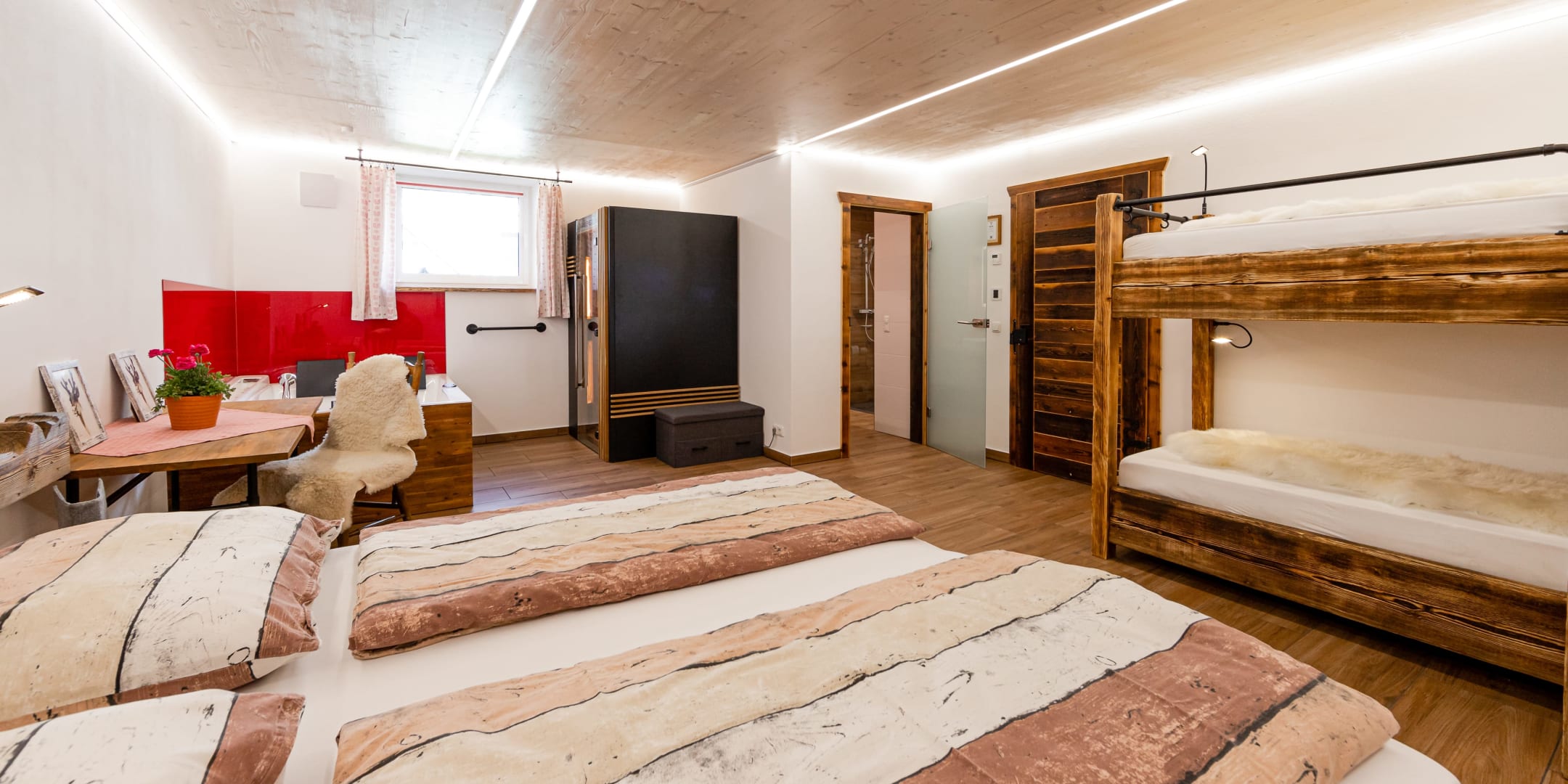 Unsere brandneue Wellness-Suite ist ausgestattet mit einem eigenen Badezimmer inkl. WC, einer Infrarotkabine sowie einem Whirlpool. Siehst du das selbstgemachte Bett? Aus alten Tram haben wir die Möbel für die Wellness-Suite selbst gebaut!