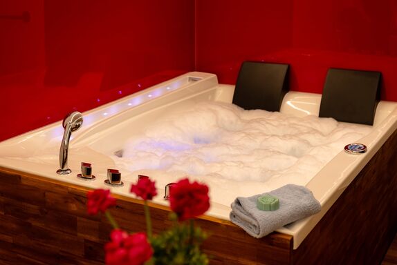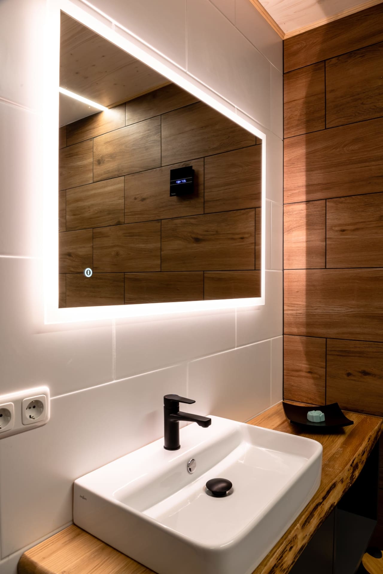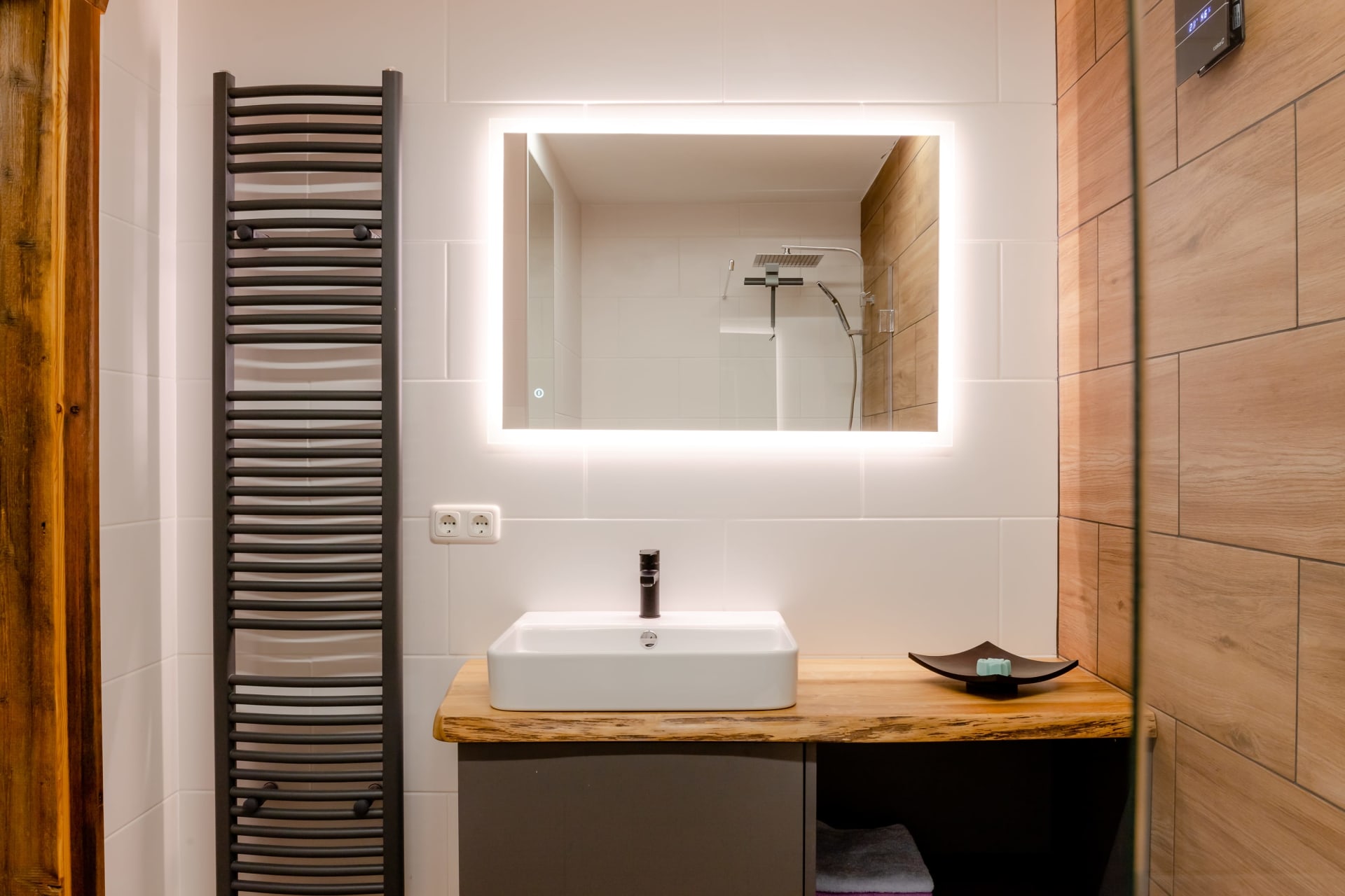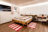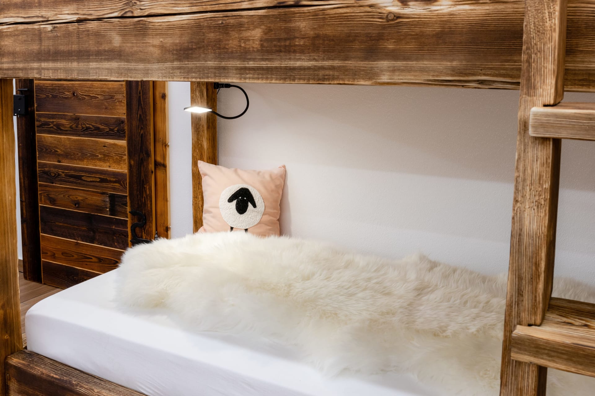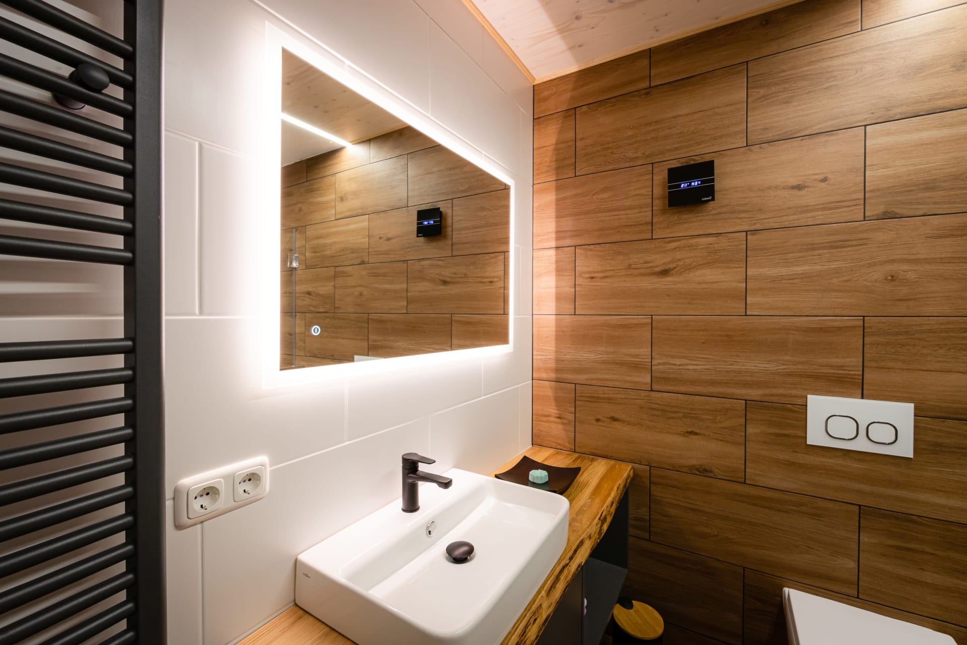 Unsere brandneue Wellness-Suite ist ausgestattet mit einem eigenen Badezimmer inkl. WC, einer Infrarotkabine sowie einem Whirlpool. Siehst du das selbstgemachte Bett? Aus alten Tram haben wir die Möbel für die Wellness-Suite selbst gebaut!