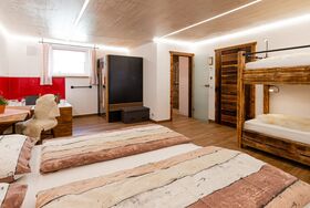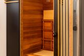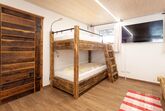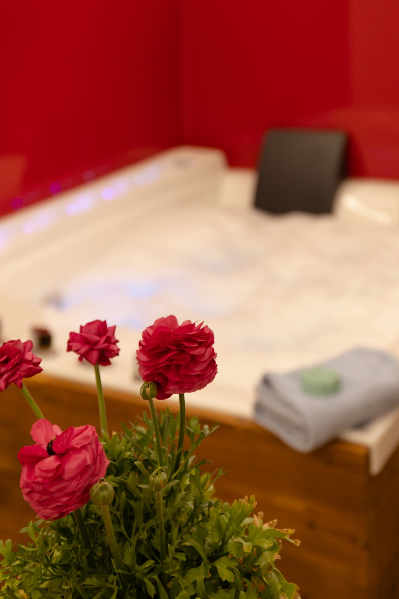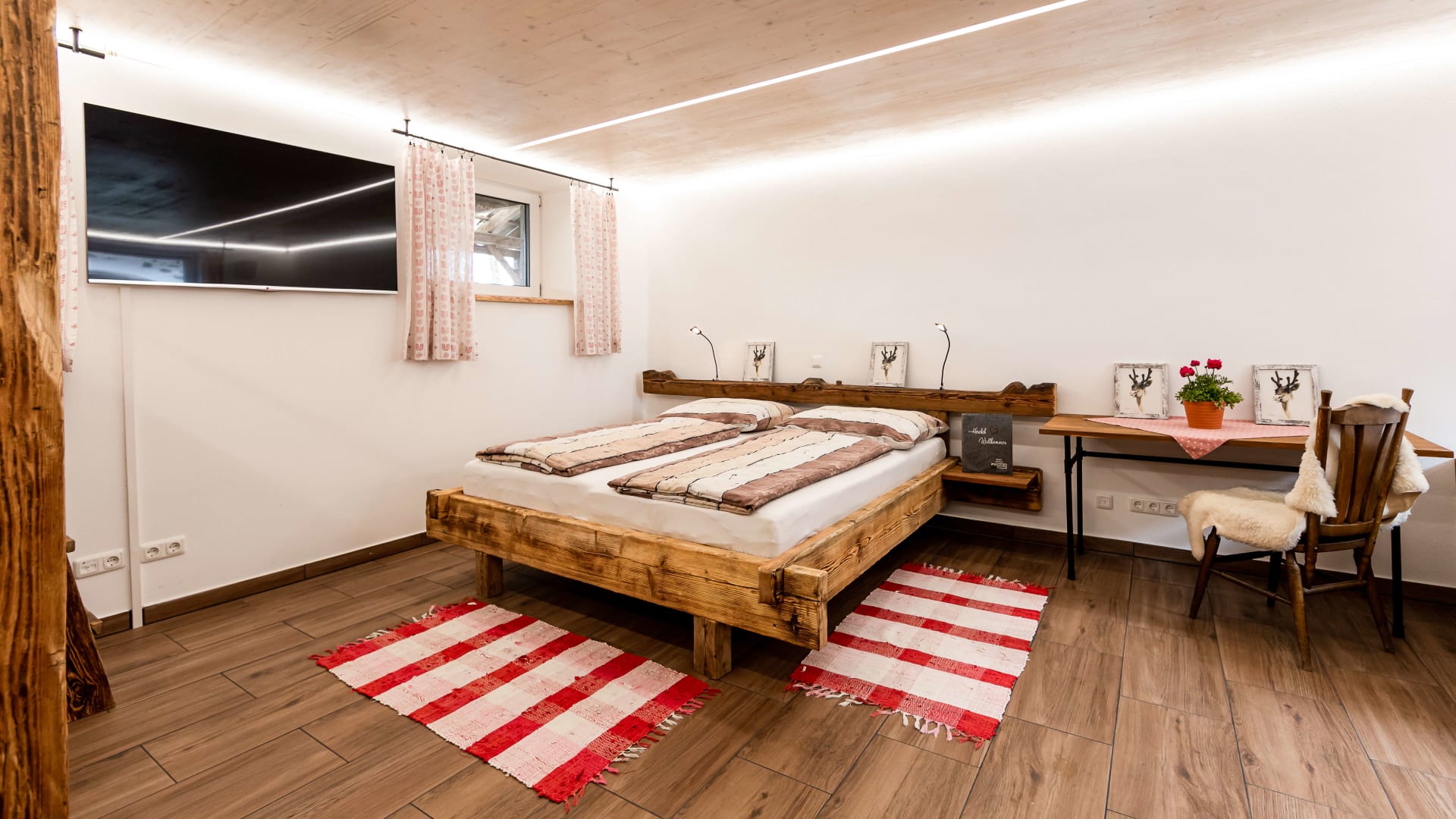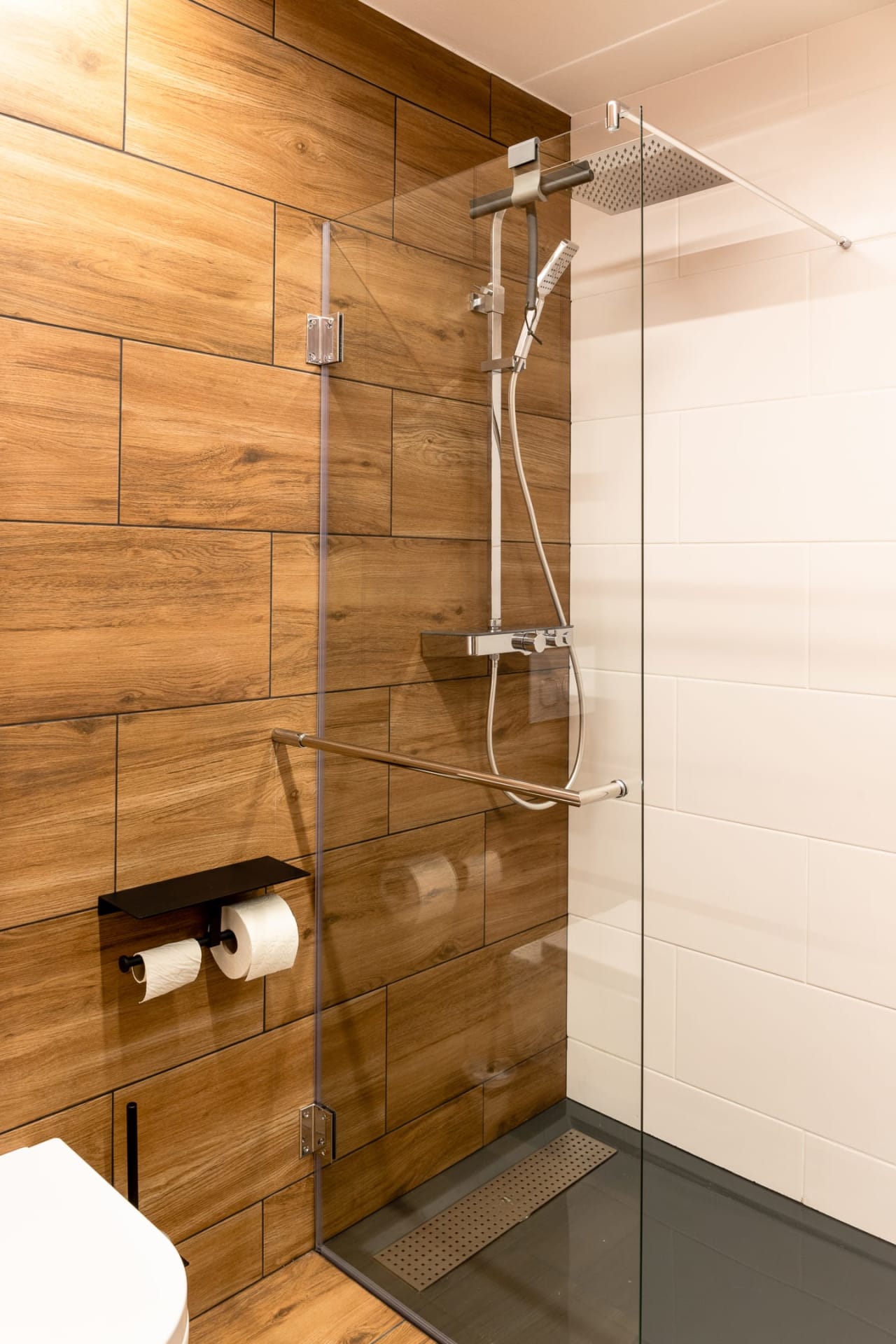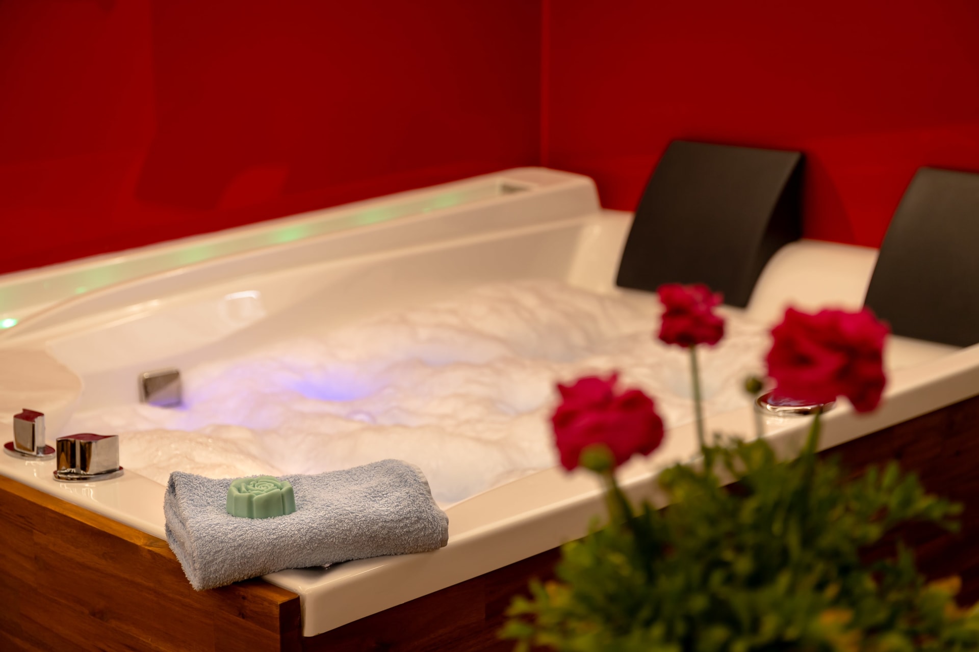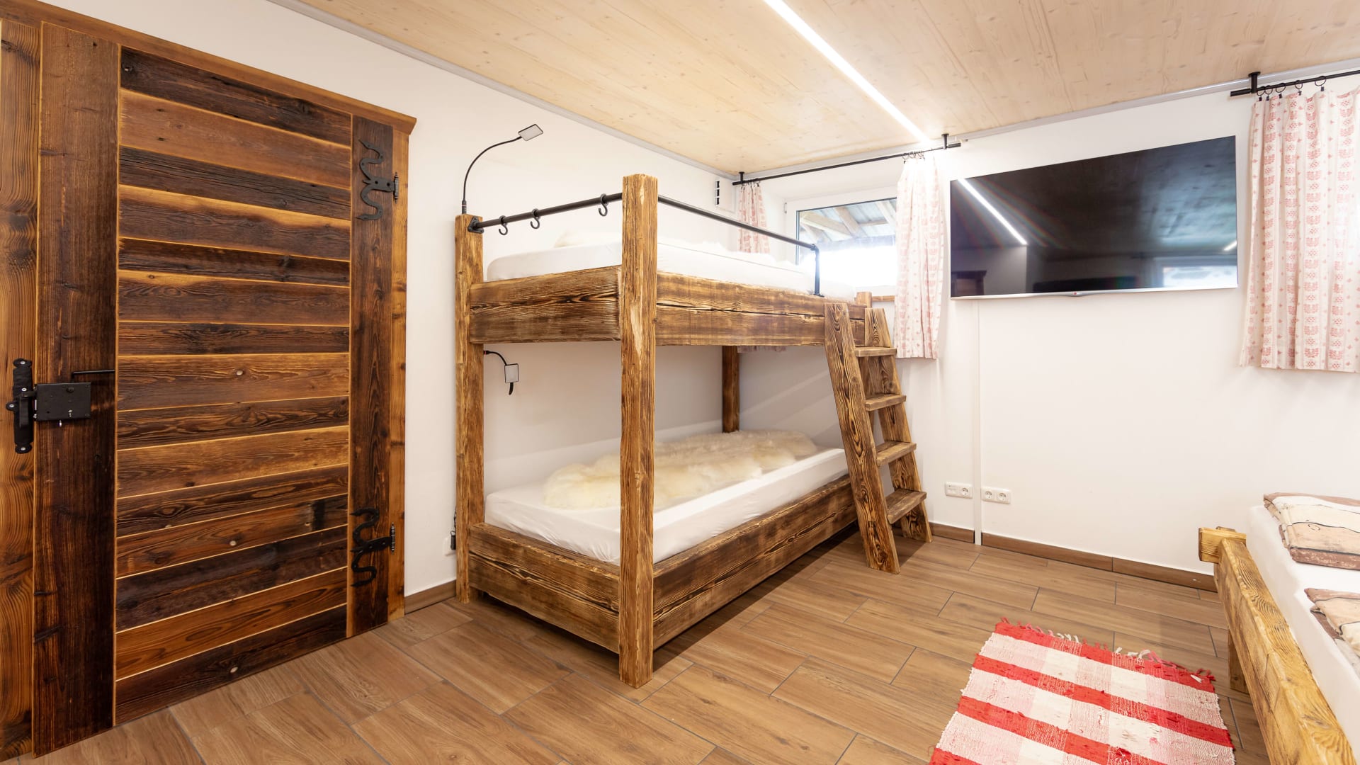 Unsere brandneue Wellness-Suite ist ausgestattet mit einem eigenen Badezimmer inkl. WC, einer Infrarotkabine sowie einem Whirlpool. Siehst du das selbstgemachte Bett? Aus alten Tram haben wir die Möbel für die Wellness-Suite selbst gebaut!