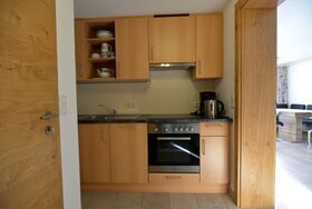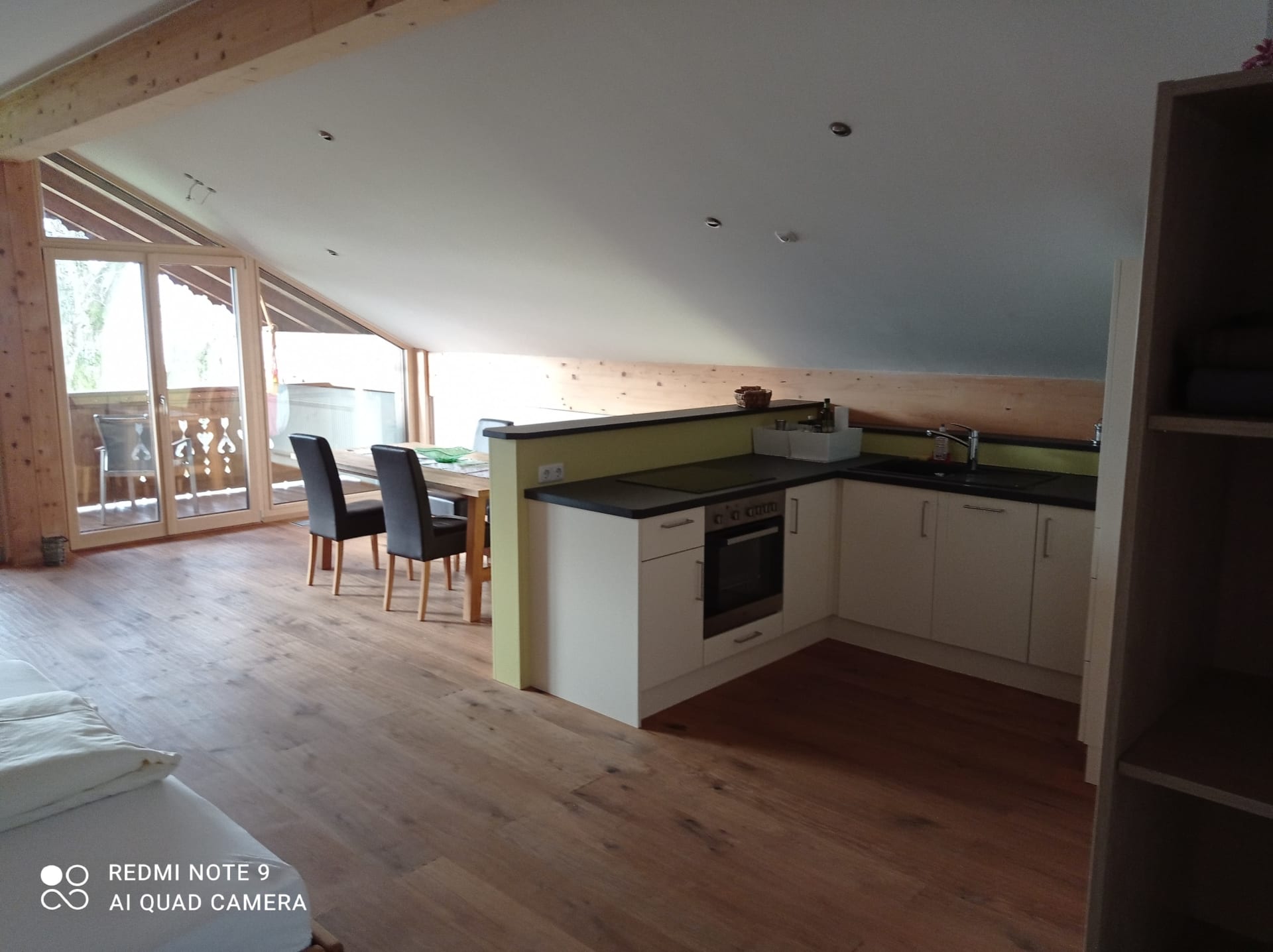 2016 fertig gestellte Ferienwohnung mit Kochnische, Wohn-Schlafraum, Schlafzimmer mit Boxspringbett, Dusche/WC und Balkon mit Seeblick.