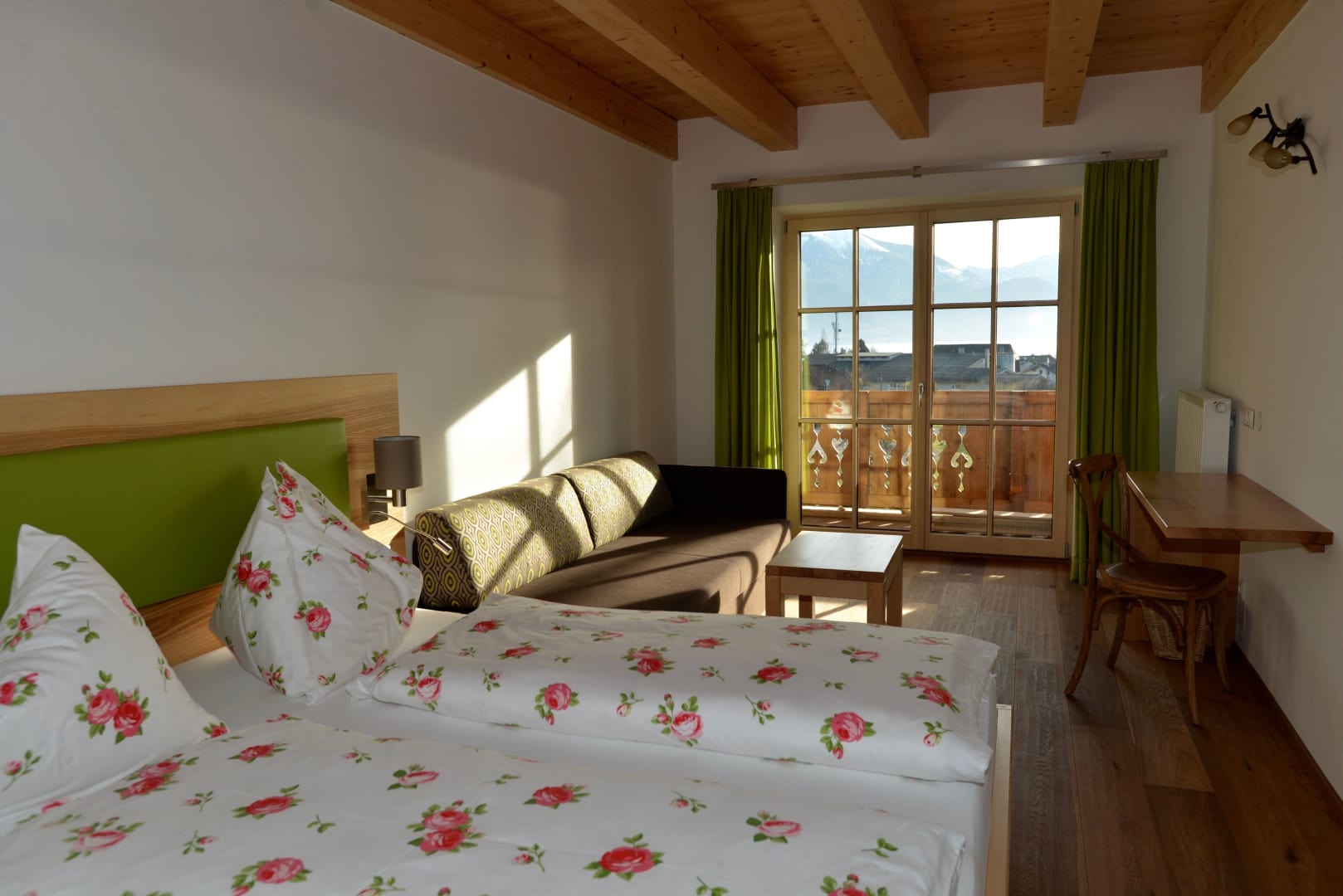Sie wohnen in komplett neu renovierten Doppelzimmern bzw. Ferienwohnungen, die mit natürlichen Materialien und Möbeln aus eigenem Holz ausgestattet sind.