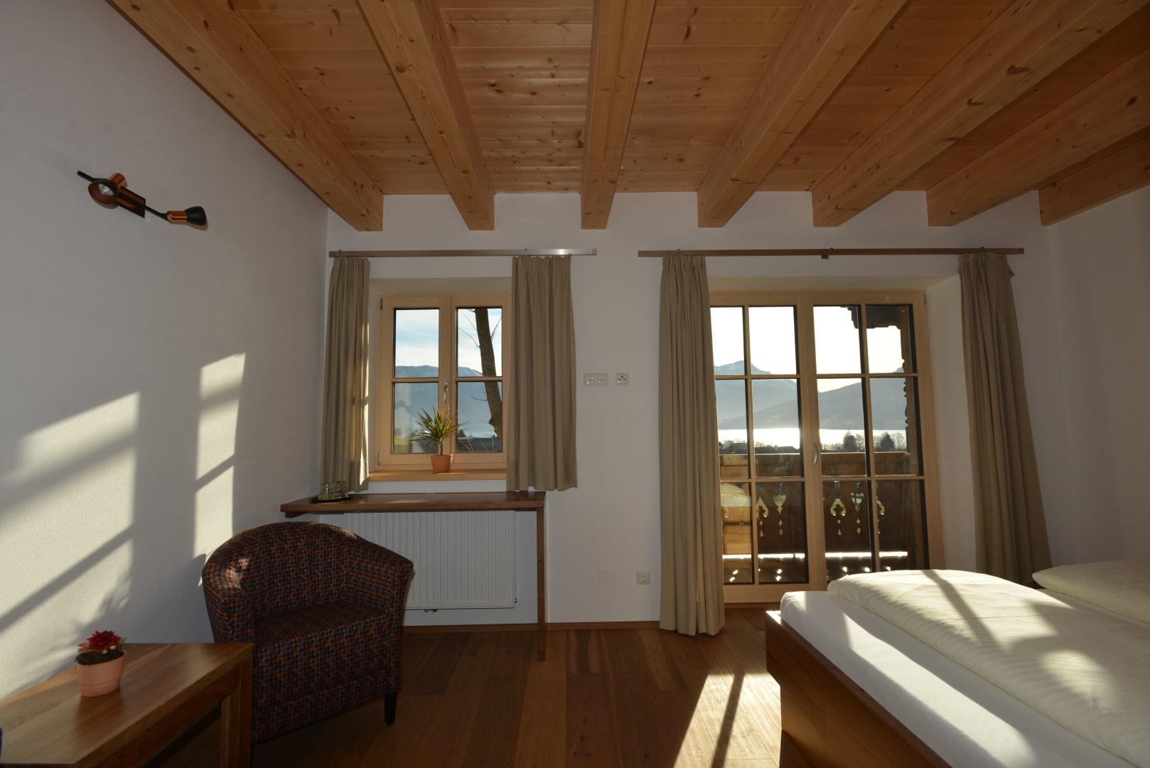 Neues Doppelzimmer mit Möbeln aus Nussholz. Großer Balkon mit Blick auf den Attersee und das Gebirge.