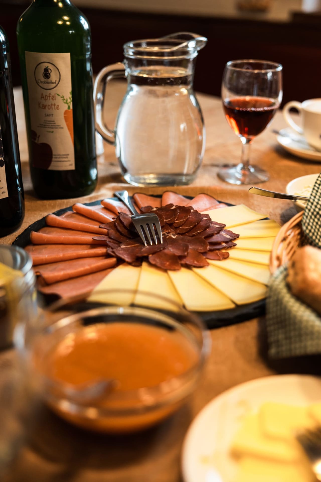Am Morgen erwartet Sie ein Frühstücksbuffet mit hofeigenen Produkten, das wir Ihnen auf unserer Terrasse oder in der gemütlichen Bauernstube anbieten.