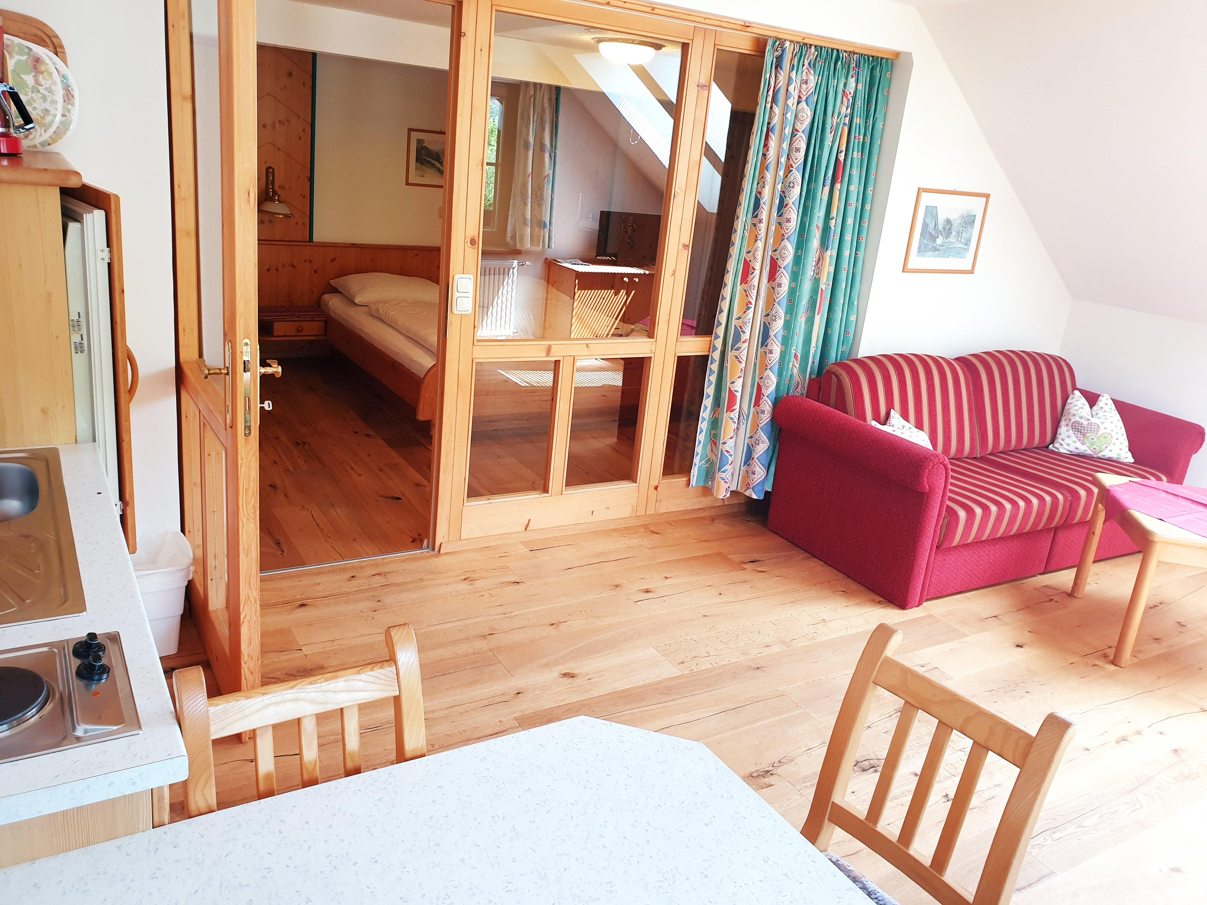 Komfortzinmer Apfelblüte (101) Komfortables ruhiges Doppelzimmer mit DU/WC Ausziehcouch, Flatscreen-Sat-TV, Kühlschrank, Telefon, gratis W-Lan im Zimmer, Haartrockner und Hotelsafe, Blick in das südliche Göriachtal Auf Wunsch Halbpension mit Menüwahl.