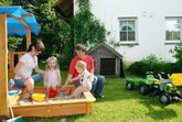 Der ideale Ruhepunkt - gleich am Haus haben Sie: große Liegewiese mit Gartengrundstück, Kinderspielplatz, Entengehege, Pferdekoppel, Parkplätze.
