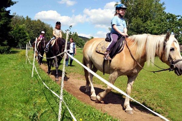 Für pferdebegeisterte Gäste bieten wir Reitgelegenheit auf unseren Pferden: geführte Ausritte, Ponyreiten für Kinder.