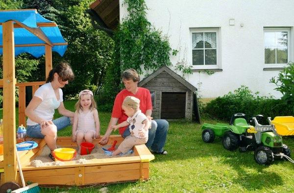 Der ideale Ruhepunkt - gleich am Haus haben Sie: große Liegewiese mit Gartengrundstück, Kinderspielplatz, Entengehege, Pferdekoppel, Parkplätze.