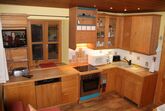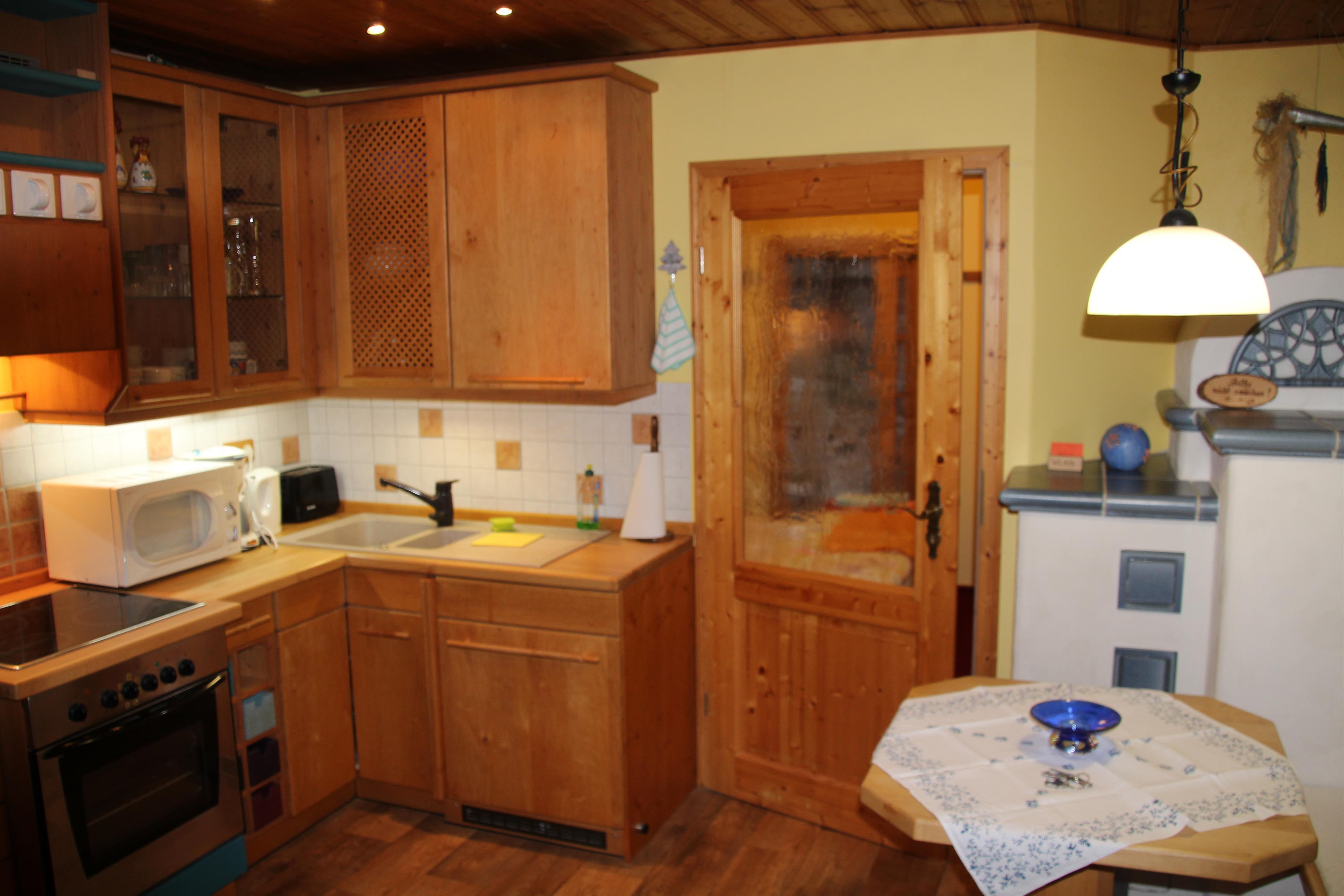 Diese befindet sich im Erdgeschoss und besteht aus einer attraktiven Wohnküche, die komplett mit Backofen, Kochherd, Dunstabzug, Kühlschrank mit Gefrierfach, Spülmaschine, Mikrowelle, Kaffeemaschine, Wasserkocher, Toaster, sowie diversem Koch- und Eßgeschirr ausgestattet ist.