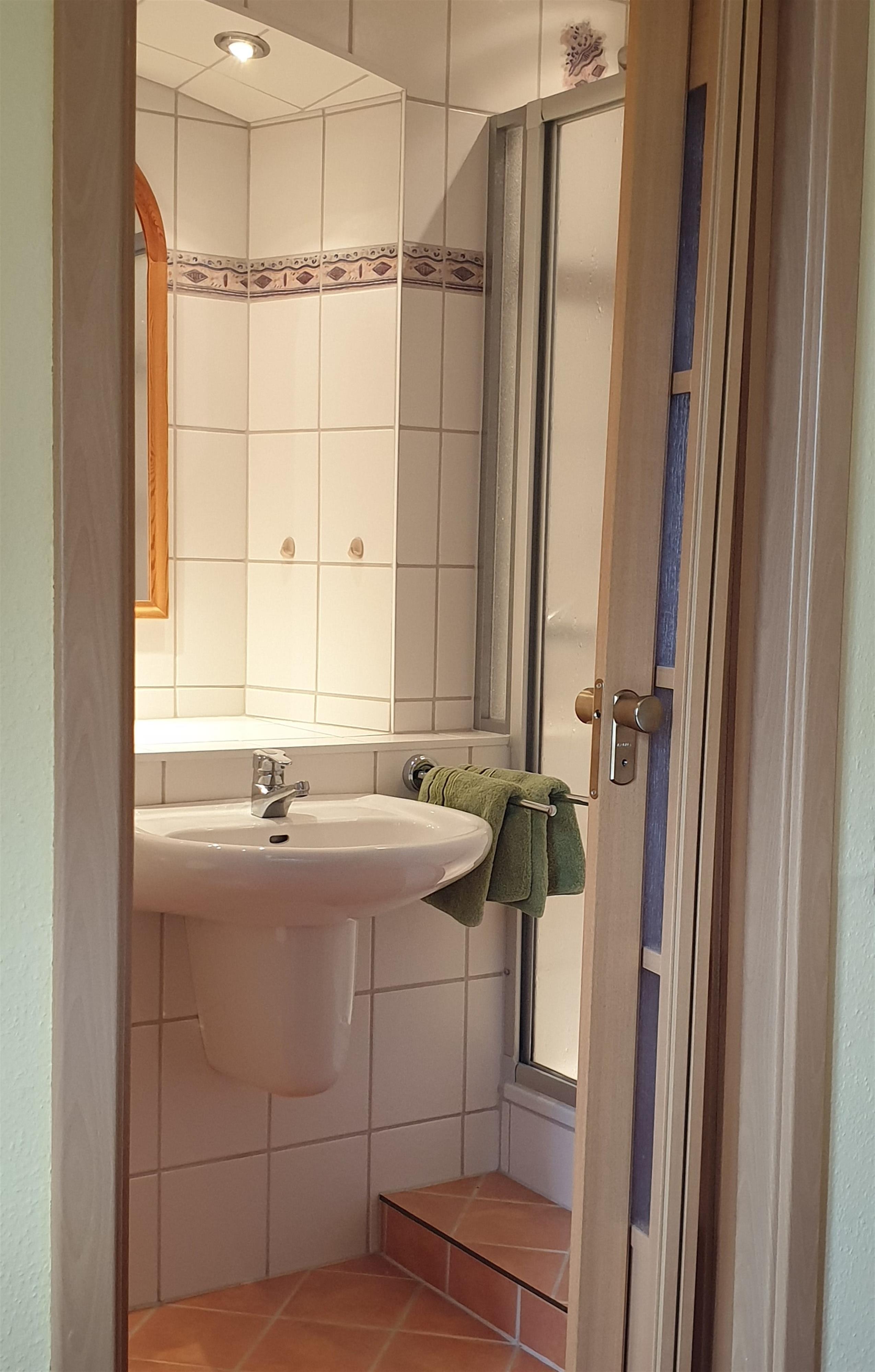 Geschmackvoll eingerichtetes Schlafzimmer, sowie Dusche und WC.