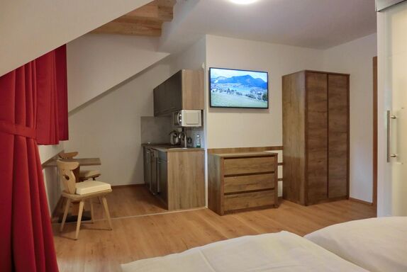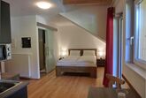 Ausstattung: Doppelzimmer mit Esstisch,Dusche/WC, kleine Küche (E-Herd, Gechirrspüler, Mikrowelle, Kaffeemaschine, Kühlschrank, Geschirr), WLAN, Smart-TV.