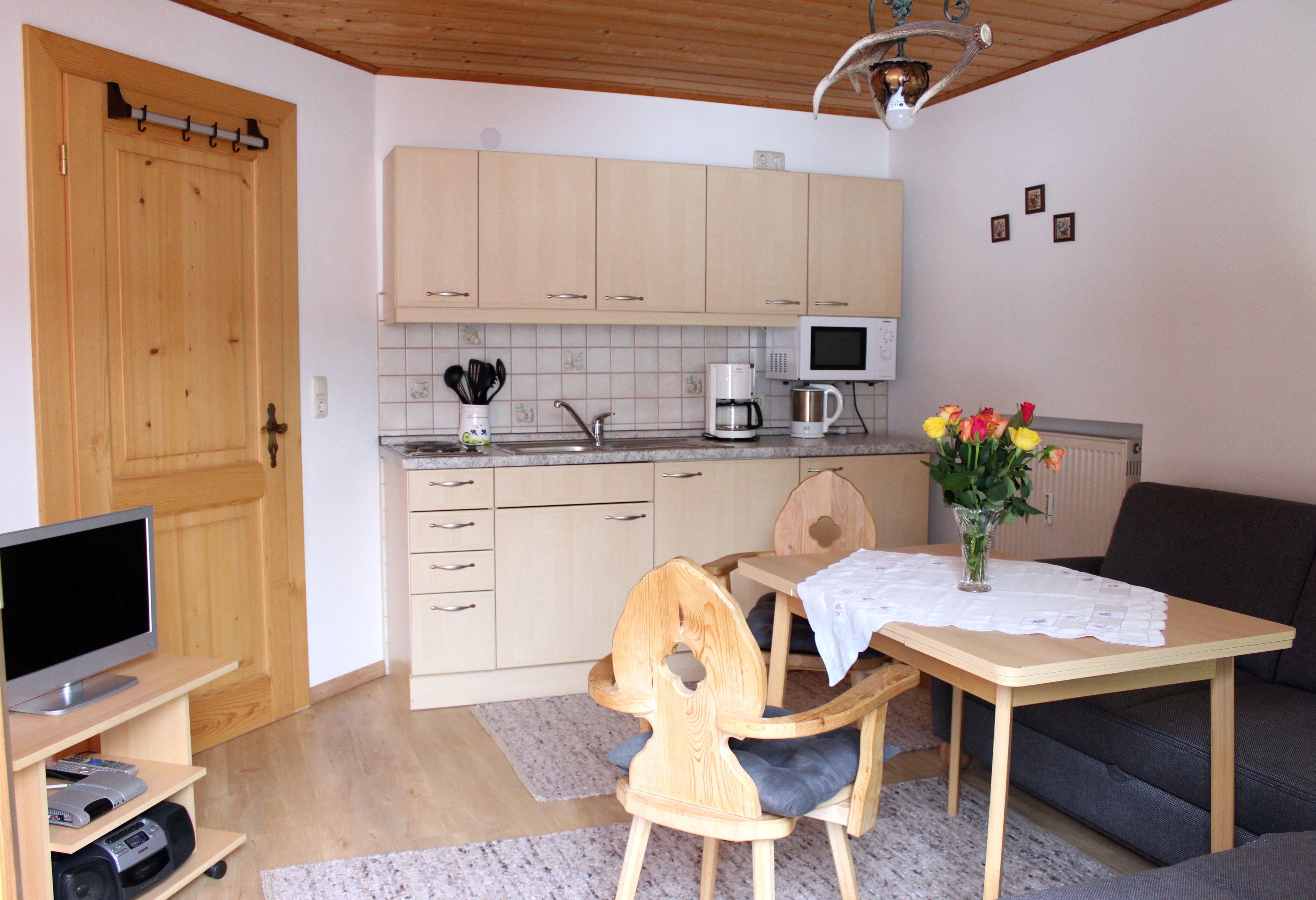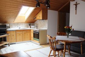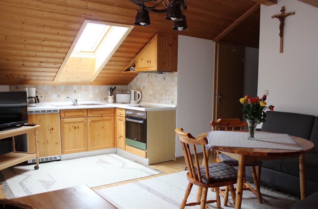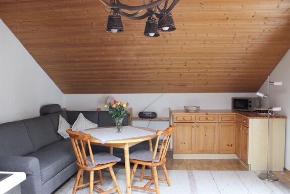 Die Ferienwohnung Nr. 3 für 2-3 Personen, ca 36 m2, Dachgeschoss, Ausstattung: Wohnküche und Schlafcouch für 3. Person, Schlafzimmer, Bad/WC, Balkon, Wlan