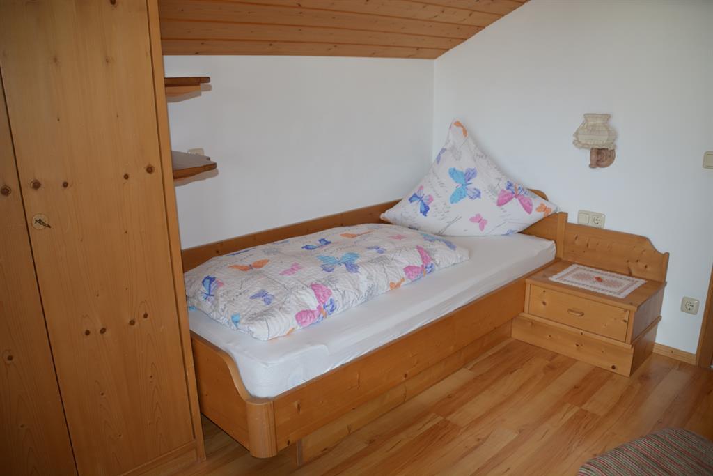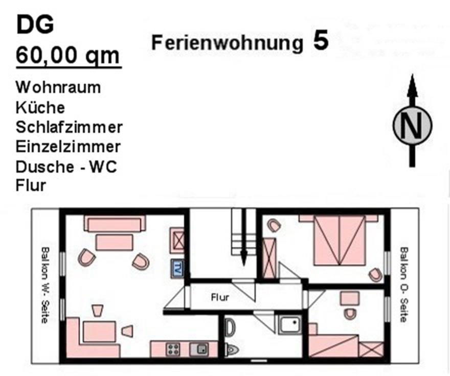 Unsere Ferienwohnung Nr. 5 befindet sich im 2. Stock. Sie hat ein Doppelzimmer und ein Einzelzimmer mit Balkon zur Ostseite, mit Blick auf die Berge. Neu-Bettenhöhe altersgerecht.Diese Wohnung bietet sich für Gäste an, die gerne getrennt schlafen möchten. Der Wohnungspreis erhöht sich bei Benutzung des 2ten Schlafzimmers ab 5,00 € pro Tag. Dusche/WC mit Dachfenster. Flur mit Garderobe und Ablagen. W-lan kostenlos!