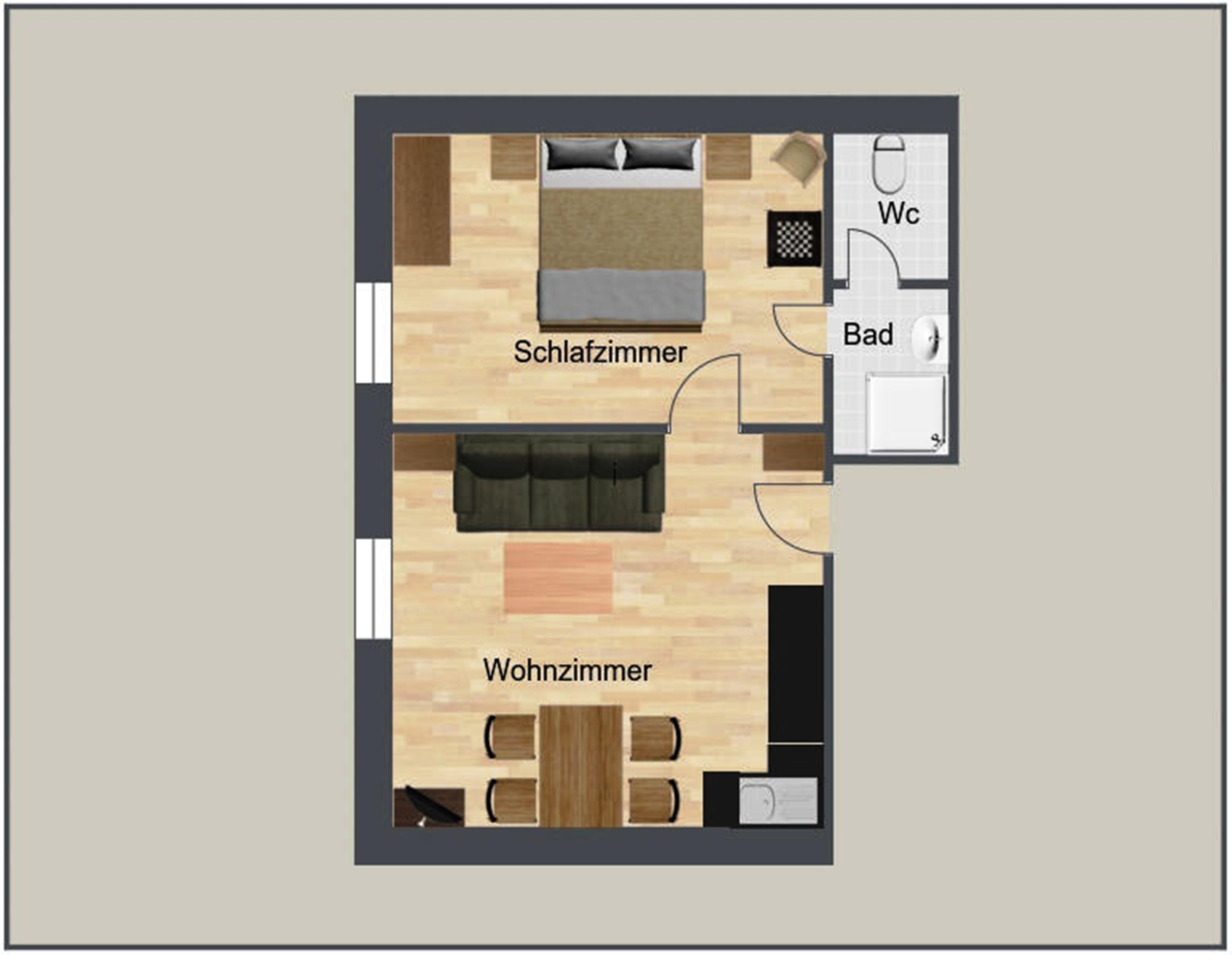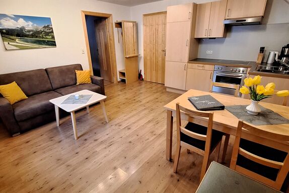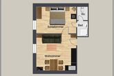 Kleine Zweizimmerwohnung mit 38m² für 2-4 Personen, ein Schlafzimmer mit einem Doppelbett, Dusche, WC. Ein Wohnraum mit ausziehbarer Couch für 2 Personen, mit Sat-TV, Küche und Essecke. Die Wohnung ist im 2. Stock.