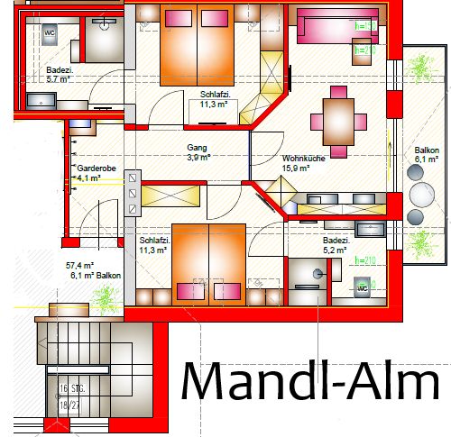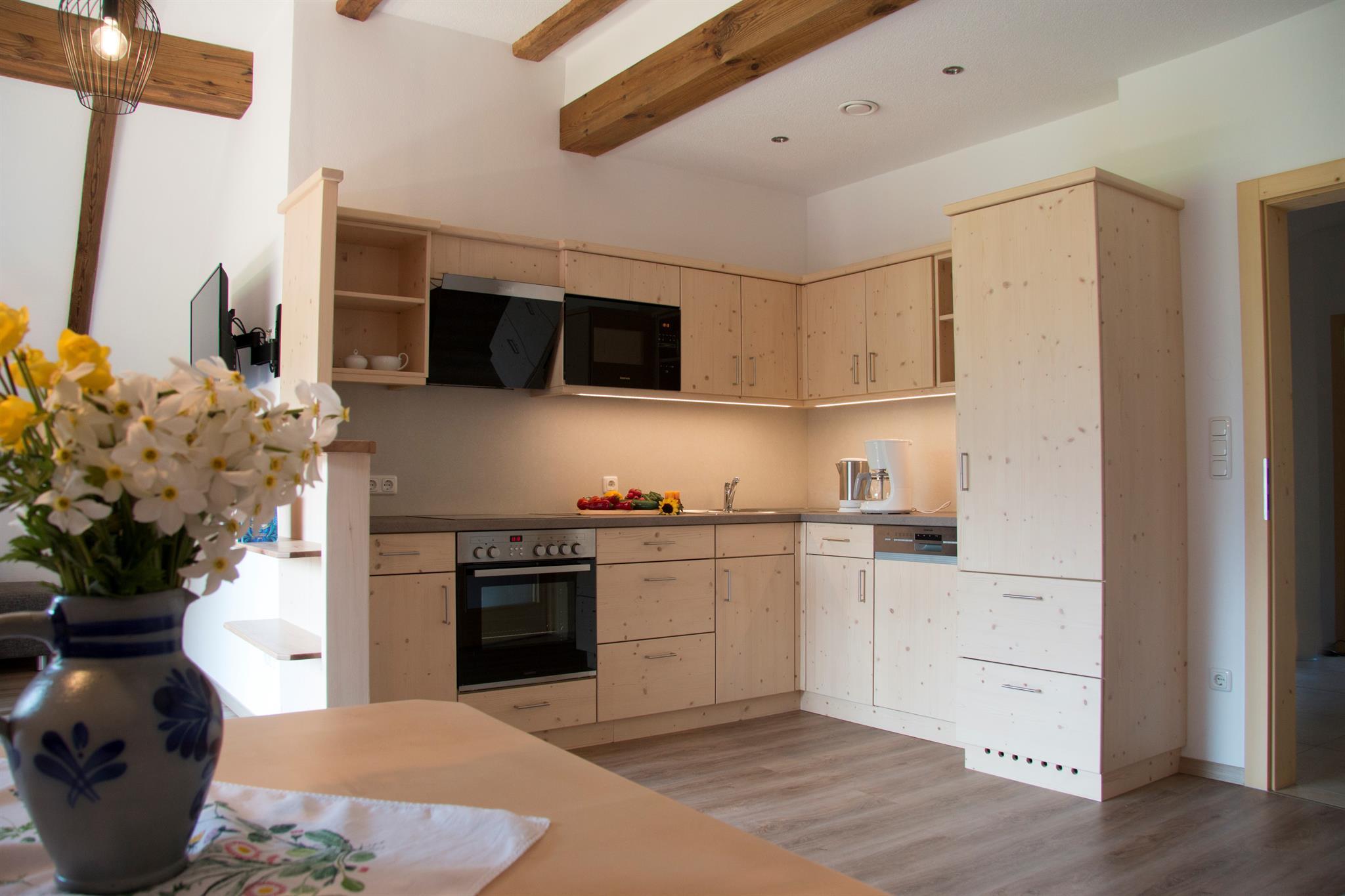Gemütlich eingerichtete Ferienwohnung mit zwei getrennten Schlafzimmern und jeweils eigener Dusche und WC, Wohnküche, Ausstattung mit heimischen Vollholzmöbeln, Balkon mit herrlichem ausblick auf viele Gipfel der Kalkalpen, SAT TV in jedem Zimmer, Wohnraumlüftung - gratis Internet
