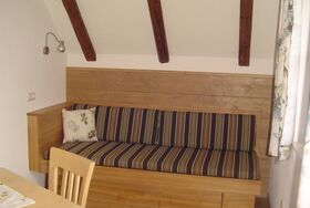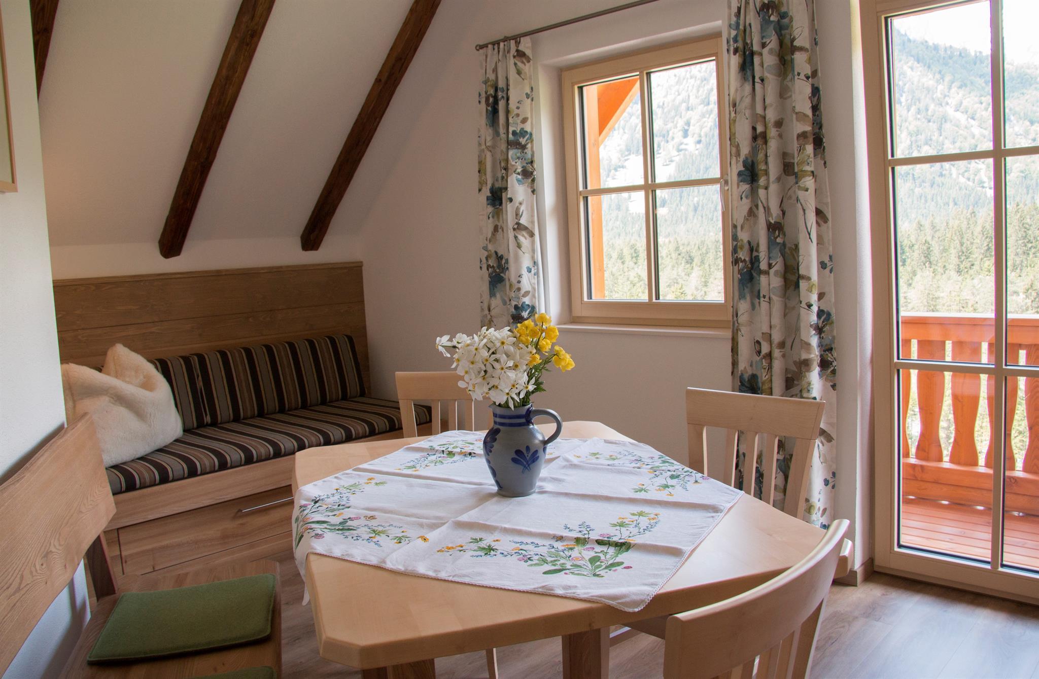 Ab 29. Dezember 2018 - neu errichtetes Doppelzimmer mit Kochgelegenheit und Eßtisch, herrlicher Ausblick auf viele Gipflen der Kalkalpen, Vollholzmöbel, Balkon, SAT TV, gratis Internet