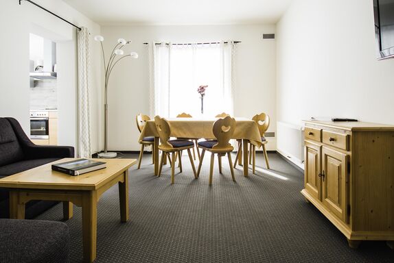 2 getrennte Schlafzimmer (1 Schlafzimmer mit Doppelbett und zwei Einzelbetten), großes Wohnzimmer mit Schlafsofa für 2 Personen, große angeschlossene Küche, sehr großes Badezimmer mit Dusche, 2 Waschbecken, Waschmaschine getrenntes WC, Zugang zur Terrasse über Flur Küche: Kühlschrank, Geschirrspülmaschine (Tabs vorhanden), Backofen, Mikrowelle, Elektroherd, Kaffeemaschine mit Filter, Wasserkocher, Dunstabzug, Geschirr, Geschirrtücher, Putzmittel, Safe, Flachbildschirm mit Kabelfernsehen, Fußbodenheizung, Allegiker Bettwäsche, Decken, Hand- und Badetücher, Bettwäsche, Harrtrockner, gratis W-Lan, großer Skiraum mit Skischuhtrockner im verschließbaren Keller, Lift
