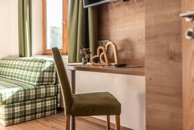 Zimmer mit DU/WC, TV und Balkon. Jedes Zimmer ist mit einem Safe ausgestattet. Das 3. Bett ist eine Couch.