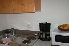Ferienwohnung mit Wohnschlafraum, Küche mit Mikrowelle, TV, DU/WC und Südbalkon