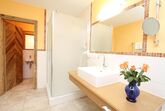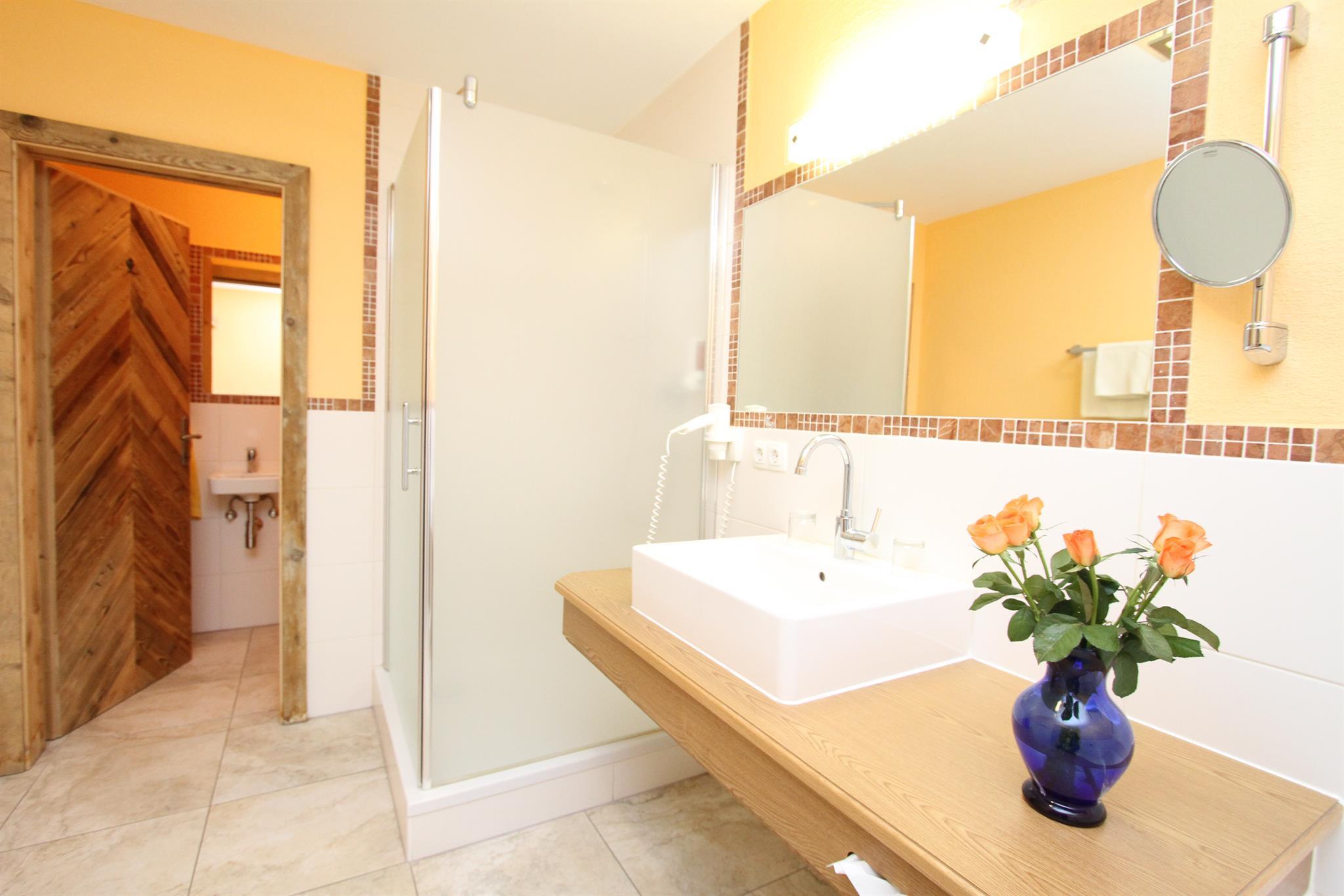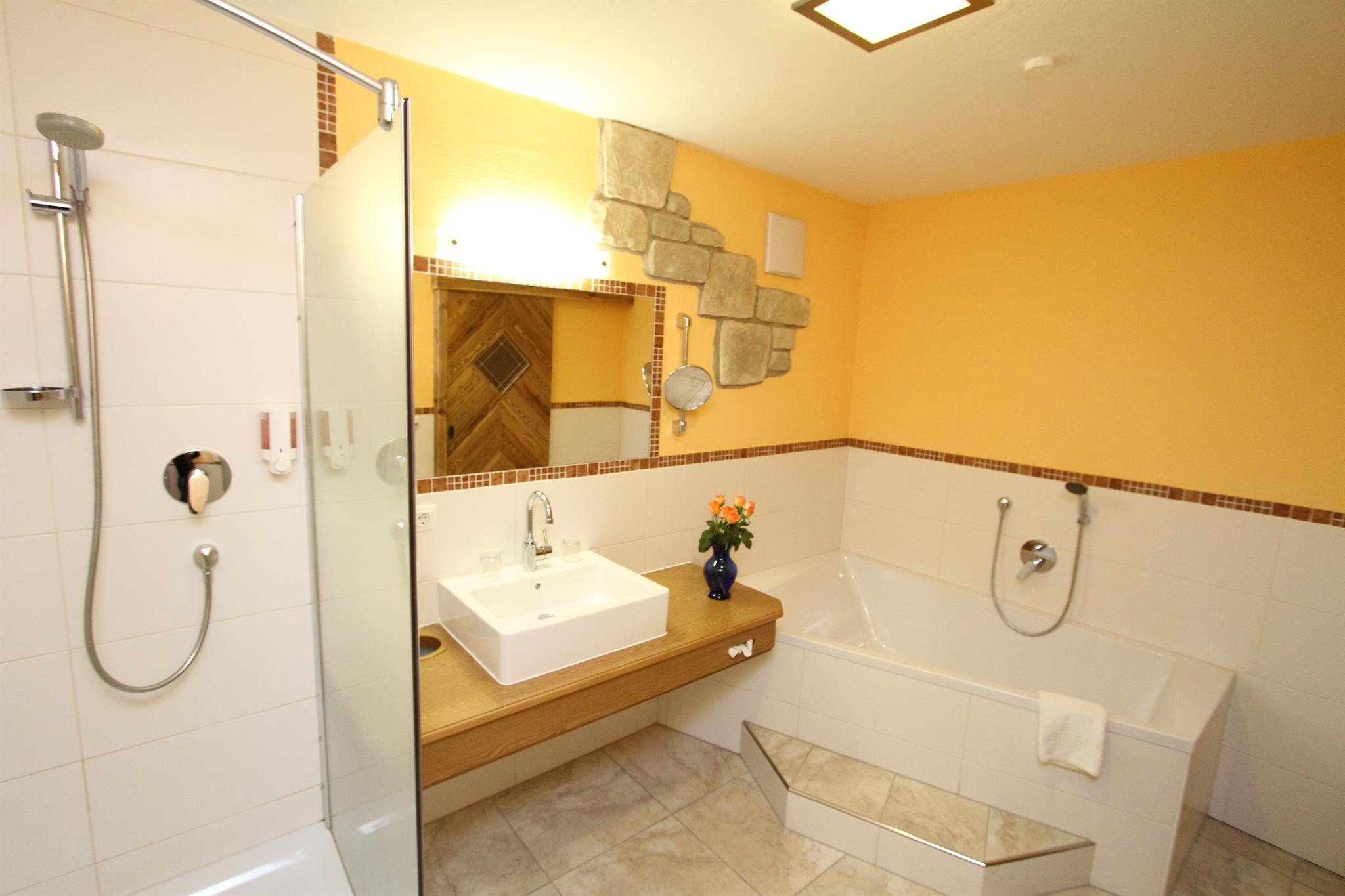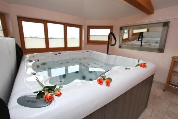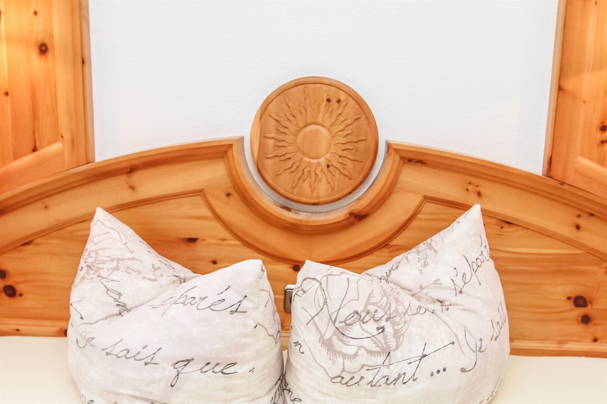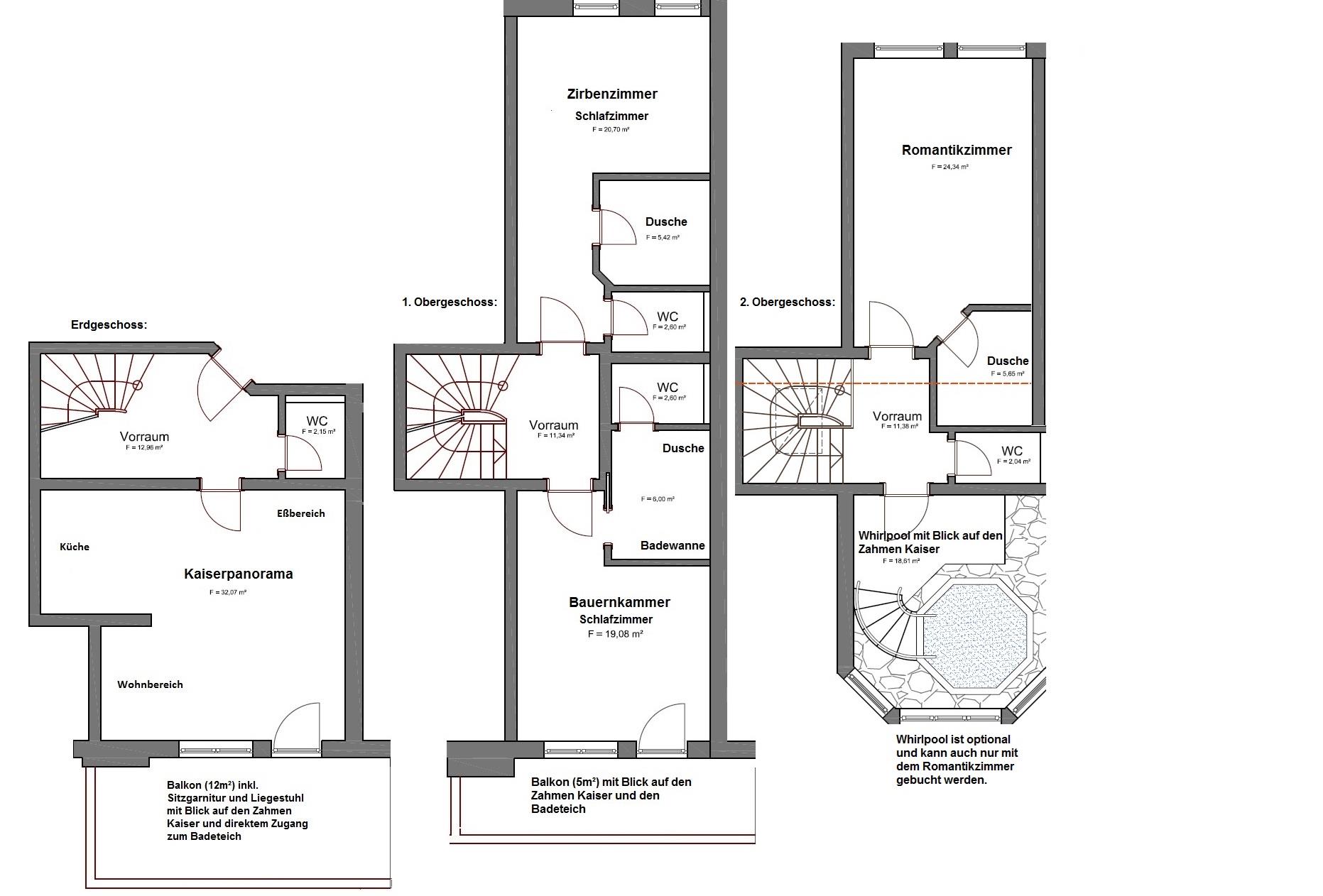 Eine großzügige Ferienwohnung für 4-8 Personen verteilt auf 3 Stockwerke mit Whirlpool. Im untersten Geschoss befindet sich die Küche mit allen E- Geräten und Wohnzimmer mit Kachelofen und ein Balkon mit direktem Abgang zum Badeteich. Alle drei Schlafzimmer sind mit TV, Radio, DU/WC ausgestattet.