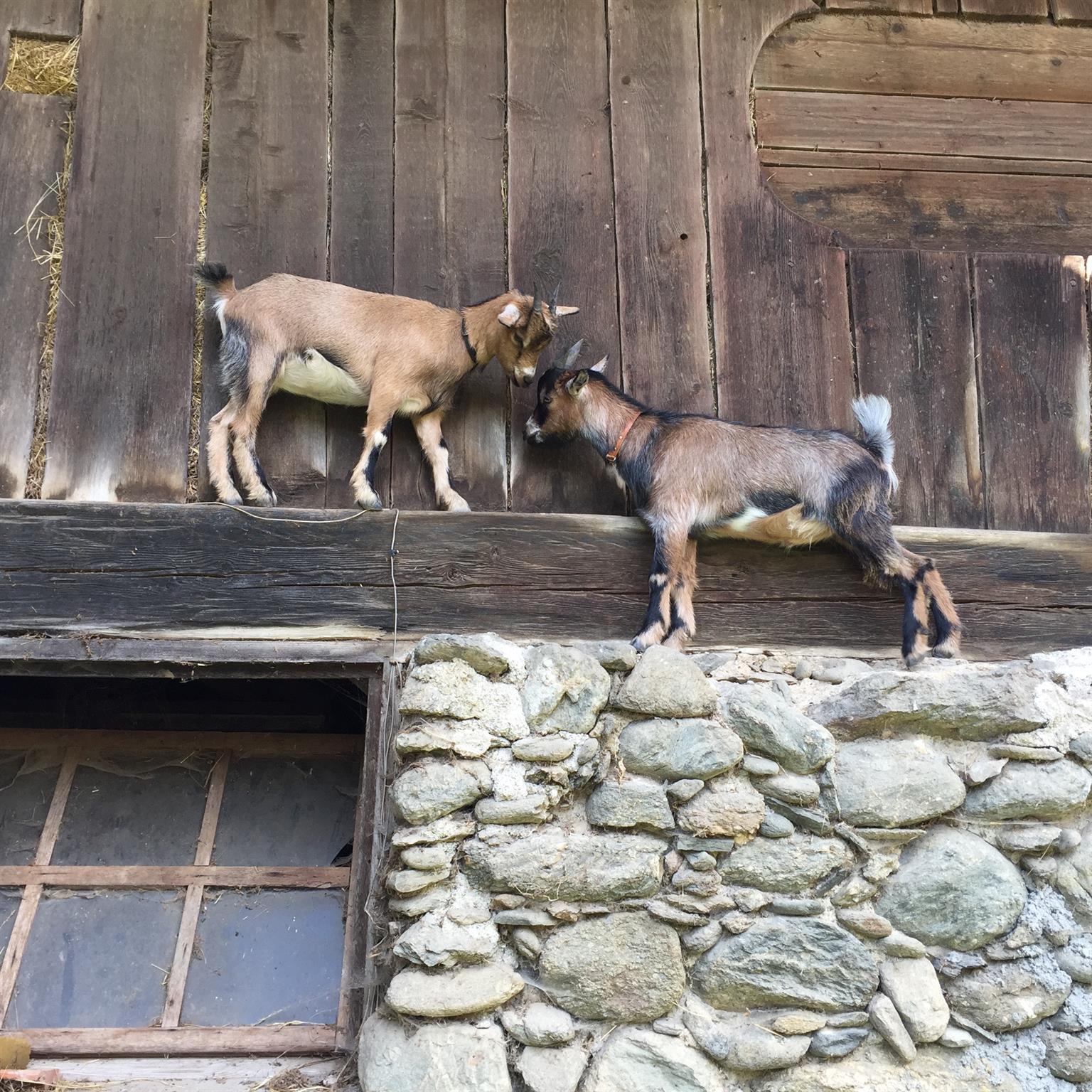 Angela und Werner, Barack und Hillary oder Bernie und Condoleezza… Es ist immer was los am Hof… Kühe, Katzen, Hasen, Hühner und insbesondere unsere Zwergziegen sind neugierig und ständig auf der Suche nach Futter und Streicheleinheiten!