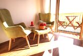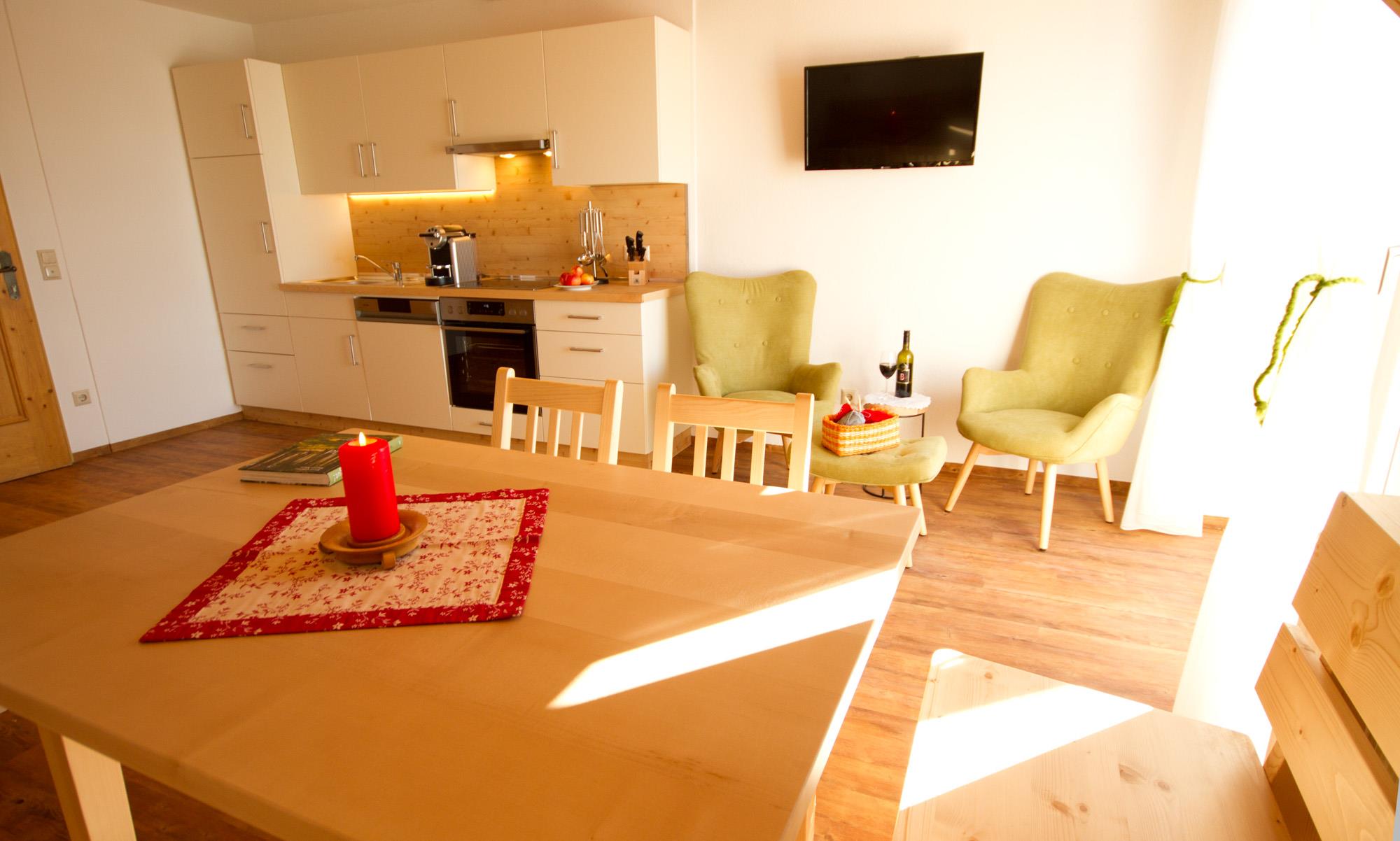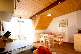 Wohnküche mit gemütlicher Essecke und Balkon. Küche mit Cerankochfeld und Backofen, Kaffeemaschine, Geschirrspüler, Kühlschrank mit Gefrierfach und Wasserkocher.