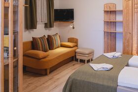 Willkommen im gemütlichen App.,Wohn-Schlafraum mit Doppelbett u.Doppelschlafcouch,Kochgelegenheit,Du/WC,